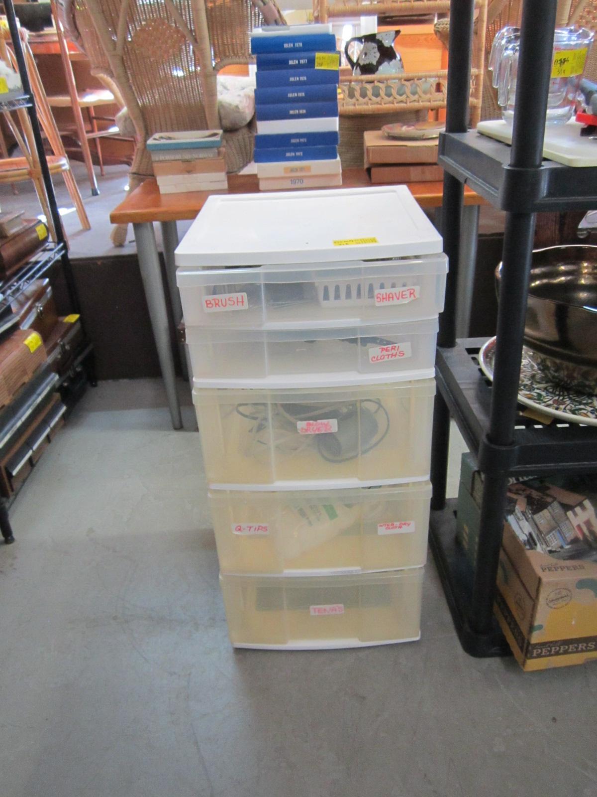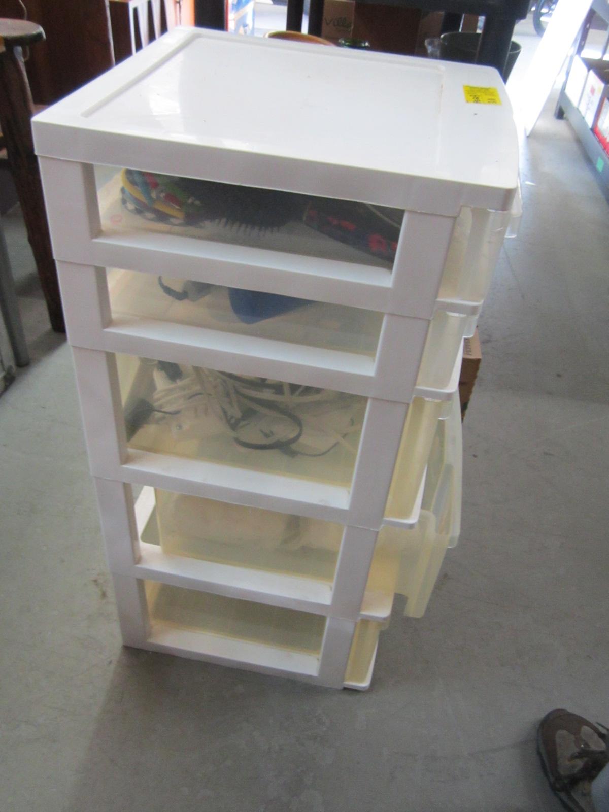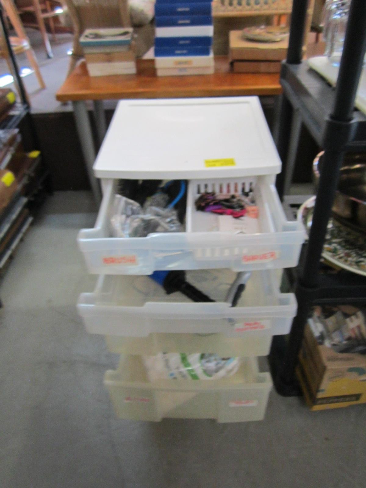 PLASTIC STORAGE UNIT W/ASST. CONTENTS - HAIR DRYER, BRUSHES, ETC.