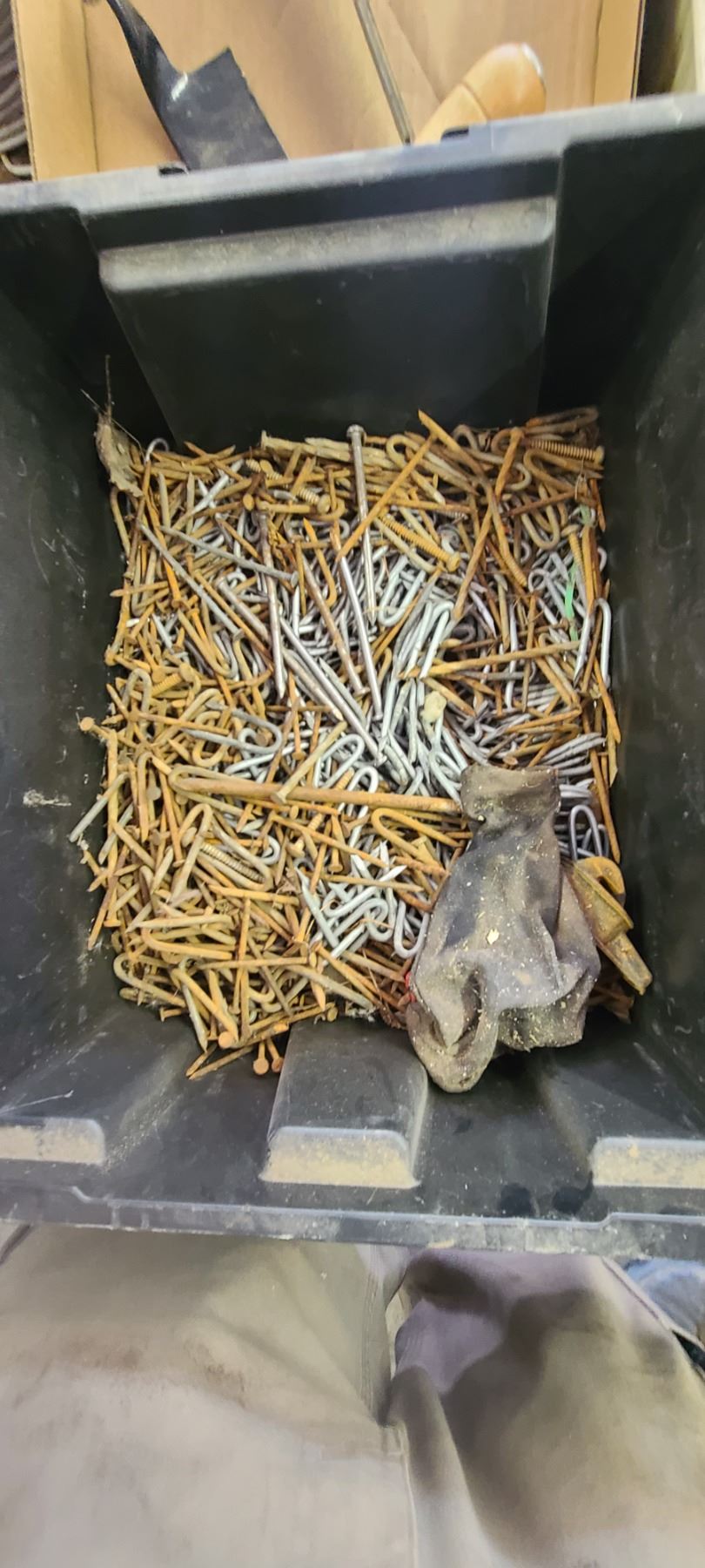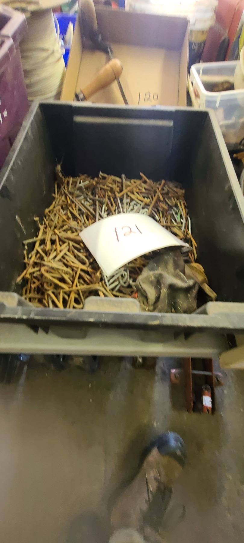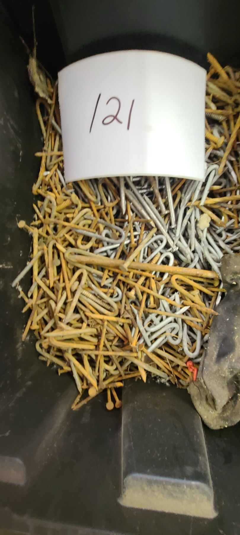 PLASTIC TOTE WITH NAILS AND FENCE STAPLES 1 1/2"