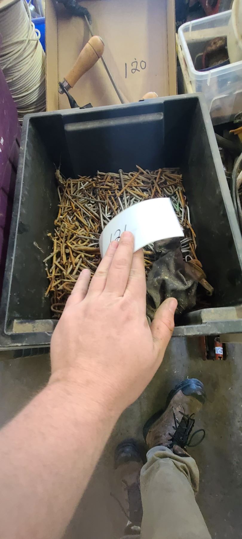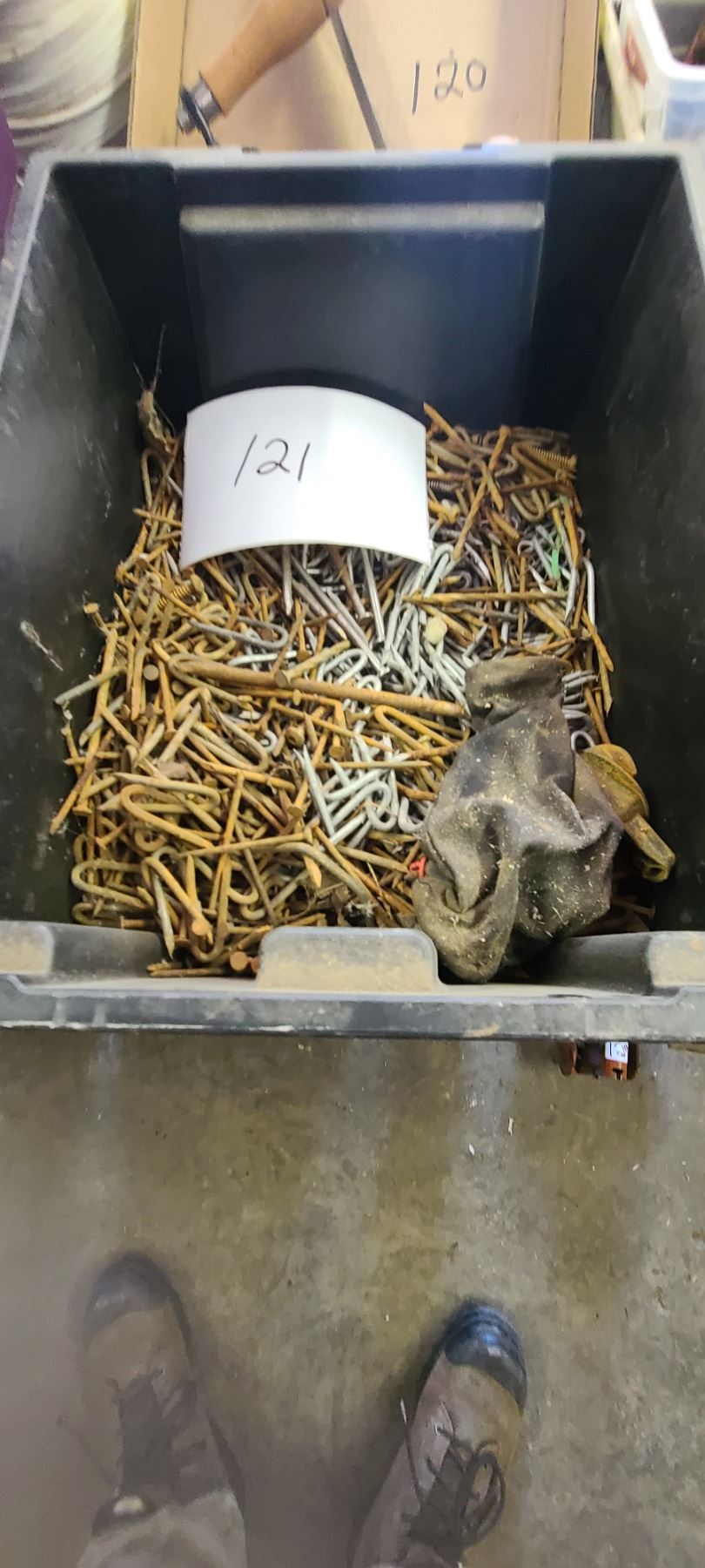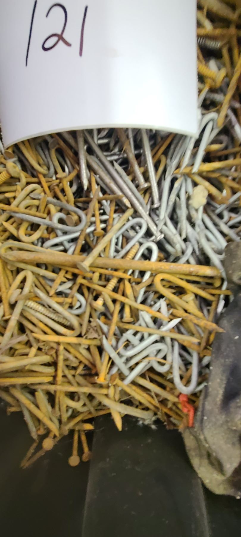 PLASTIC TOTE WITH NAILS AND FENCE STAPLES 1 1/2"