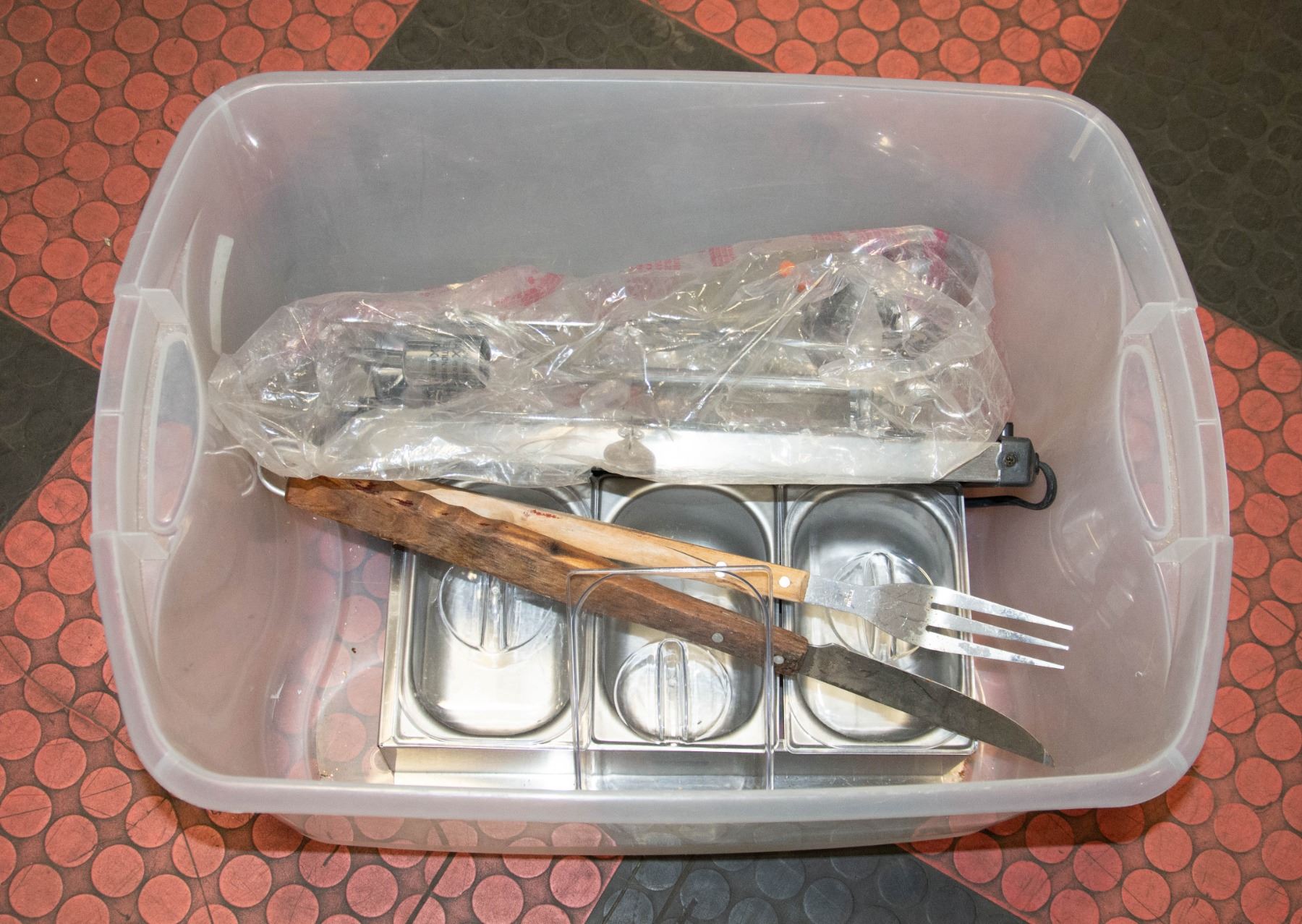 PLASTIC TUB OF HOUSEHOLD ITEMS