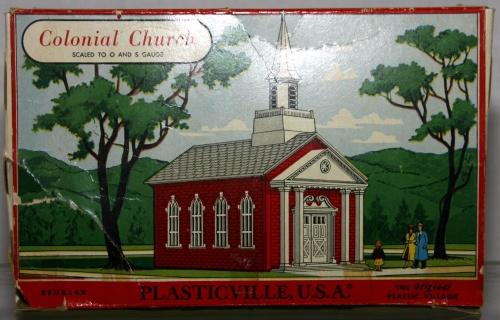 PLASTICVILLE COLONIAL CHURCH. RED, WHITE WINDOWS