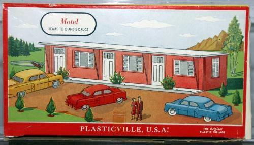 PLASTICVILLE MOTEL. SALMON WALLS, WHITE ROOF AND TRIM. MISSING 2 PLANTS. HAS GLUE MARKS.