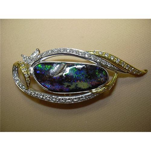 THIS IS A GREAT PLATINUM AND 18K YELLOW GOLD PENDANT. THE CENTER IS A BEAUTIFUL BLACK OPAL SHIMERING IN BLUE, GREEN, GOLD AND ORANGE. THE OPAL IS SET IN A FREE SHAPED MOUNTING DECORATED WITH MORE THEN 45 SMALL ROUND DIAMONDS AND WITH 2 BIGGER MARQUIS SHAPE DIAMONDS.