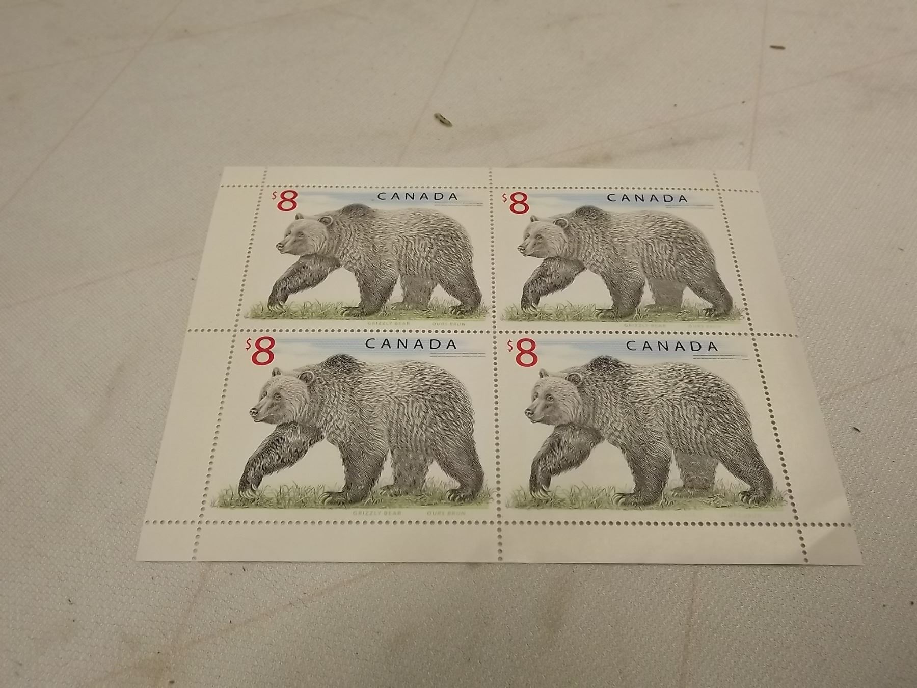 PLATE BLOCK OF 4 CANADIAN 8$ STAMPS GRIZZLY BEAR