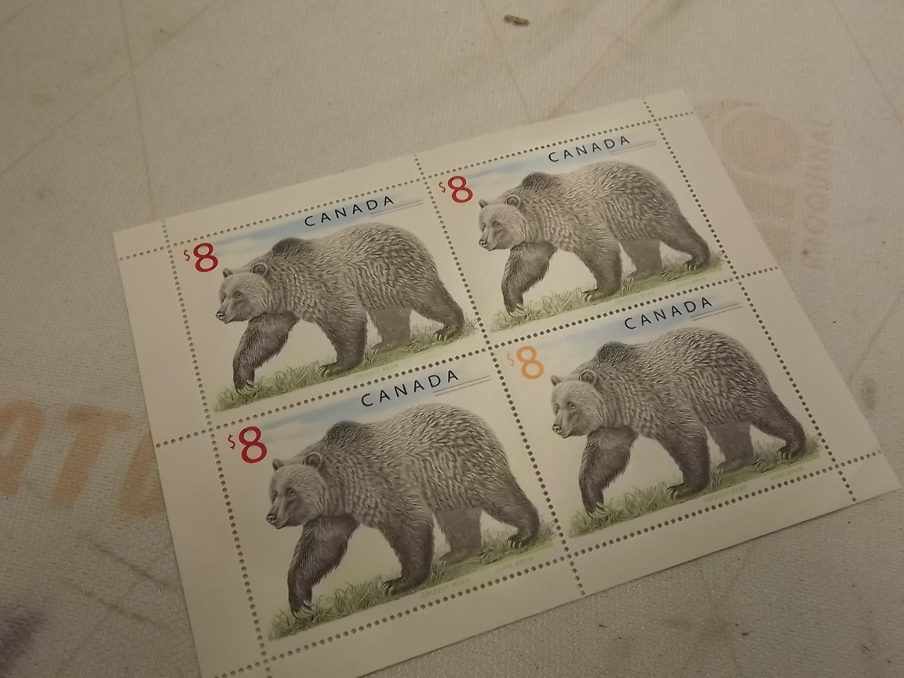 PLATE BLOCK OF 4 CANADIAN 8$ STAMPS GRIZZLY BEAR
