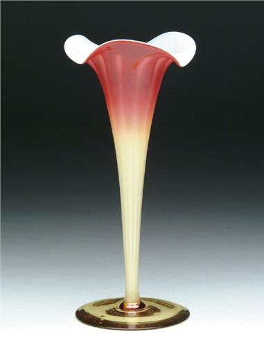 PLATED AMBERINA LILY VASE. Outstanding lily vase has fuschia shading to amber exterior with a creamy white lining and vertical ribbing with an applied amber foot. SIZE: 9-3/4 in. t. CONDITION: Very good to excellent. 5-60278