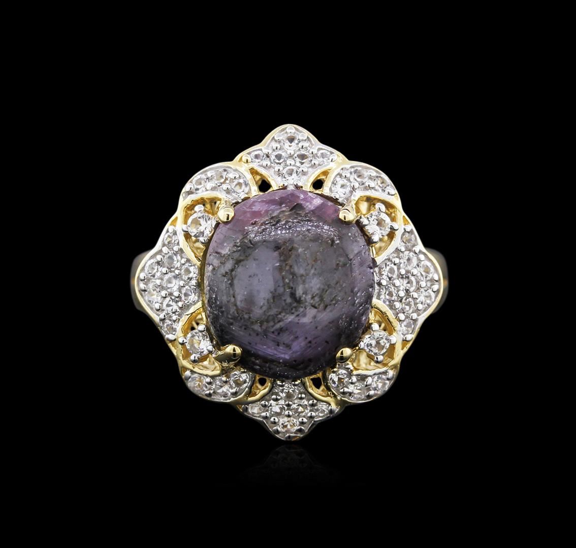One lady's polished, stamped and electronically tested solid 14k plated over silver ring mounted with : 1 Genuine Ruby (Corundum) and 42 Genuine Colorless Sapphire (Corundum)s. This item weighs 7.10 grams and fits a finger size 8.50. The setting measures 21.25 x 20.68 mm and the band measures 3.75 mm tapering down to 2.55 mm at the center of the shank. The condition is BRAND NEW. The gemstones have been analyzed in the mounting. MAIN GEMSTONE: Identity: Genuine Ruby (Corundum). Shape: Oval (Cabochon). Measurements: 12.59 x 11.27 x 6.35 mm (est.). Quantity: 1. Carat Weight: 11.90 cts (est.). Clarity Type: II=may include eye-visible features. Transparency: Opaque. Tone: Dark. Quality: 2-Commercial to Fair. ADJACENT GEMSTONE: Identity: Genuine Colorless Sapphire (Corundum). Shape: Round (Faceted). Measurements: 1.25 mm (est.) (no depth) (Average). Quantity: 42 (est.). Carat Weight: 0.67 ctw (est.). Clarity Type: II=may include eye-visible features. Hue: Colorless. Transparency: Transparent. Quality: 9-Excellent. GEMSTONE CARAT WEIGHT: 12.57 ctw. ITEM GRAM WEIGHT: 7.10 grams. GLA Appraised at $5,317.00.