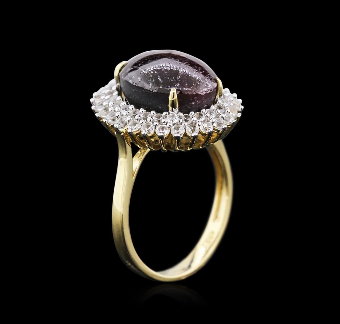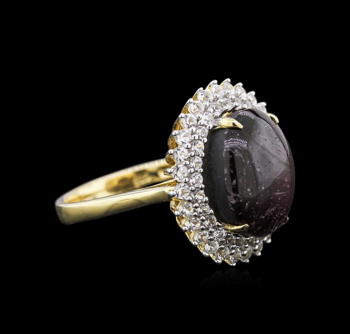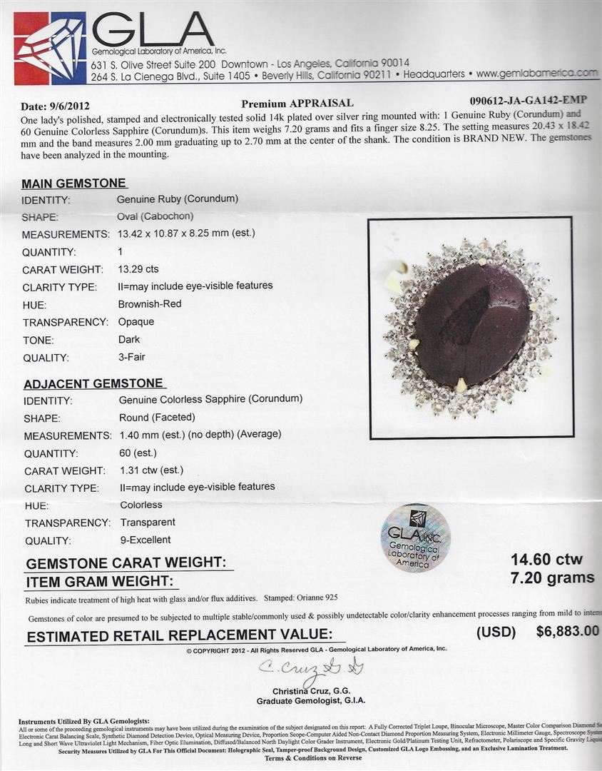 One lady's polished, stamped and electronically tested solid 14k plated over silver ring mounted with : 1 Genuine Ruby (Corundum) and 60 Genuine Colorless Sapphire (Corundum)s. This item weighs 7.20 grams and fits a finger size 8.25. The setting measures 20.43 x 18.42 mm and the band measures 2.00 mm graduating up to 2.70 mm at the center of the shank. The condition is BRAND NEW. The gemstones have been analyzed in the mounting. MAIN GEMSTONE: Identity: Genuine Ruby (Corundum). Shape: Oval (Cabochon). Measurements: 13.42 x 10.87 x 8.25 mm (est.). Quantity: 1. Carat Weight: 13.29 cts (est.). Clarity Type: II=may include eye-visible features. Hue: Brownish-Red. Transparency: Opaque. Tone: Dark. Quality: 3-Fair. ADJACENT GEMSTONE: Identity: Genuine Colorless Sapphire (Corundum). Shape: Round (Faceted). Measurements: 1.40 mm (est.) (no depth) (Average). Quantity: 60 (est.). Carat Weight: 1.31 ctw (est.). Clarity Type: II=may include eye-visible features. Hue: Colorless. Transparency: Transparent. Quality: 9-Excellent. GEMSTONE CARAT WEIGHT: 14.60 ctw. ITEM GRAM WEIGHT: 7.20 grams. GLA Appraised at $6,883.00.