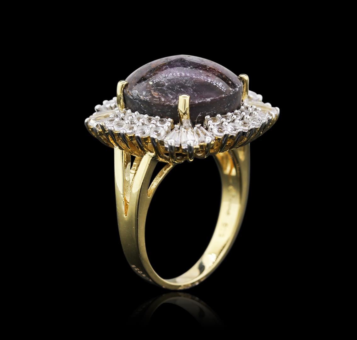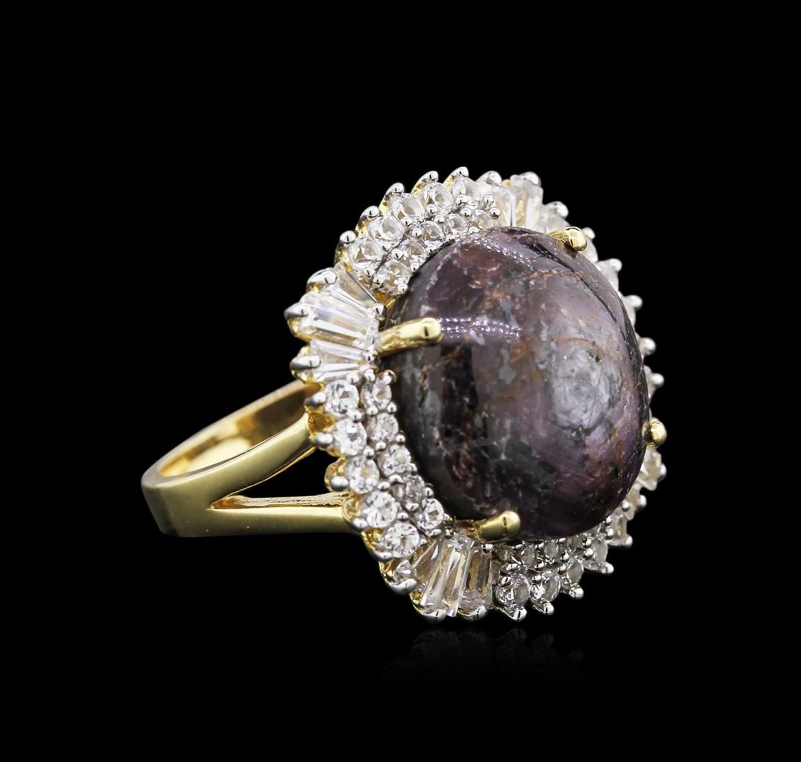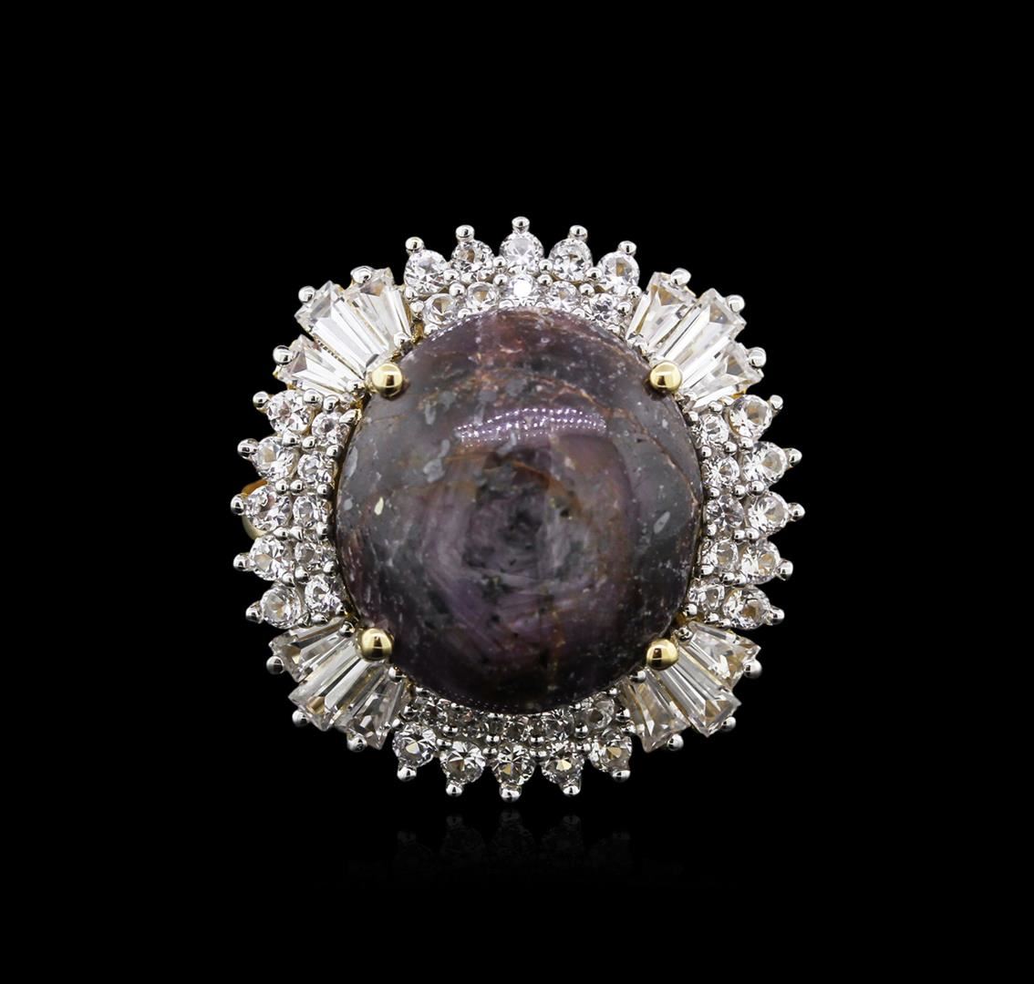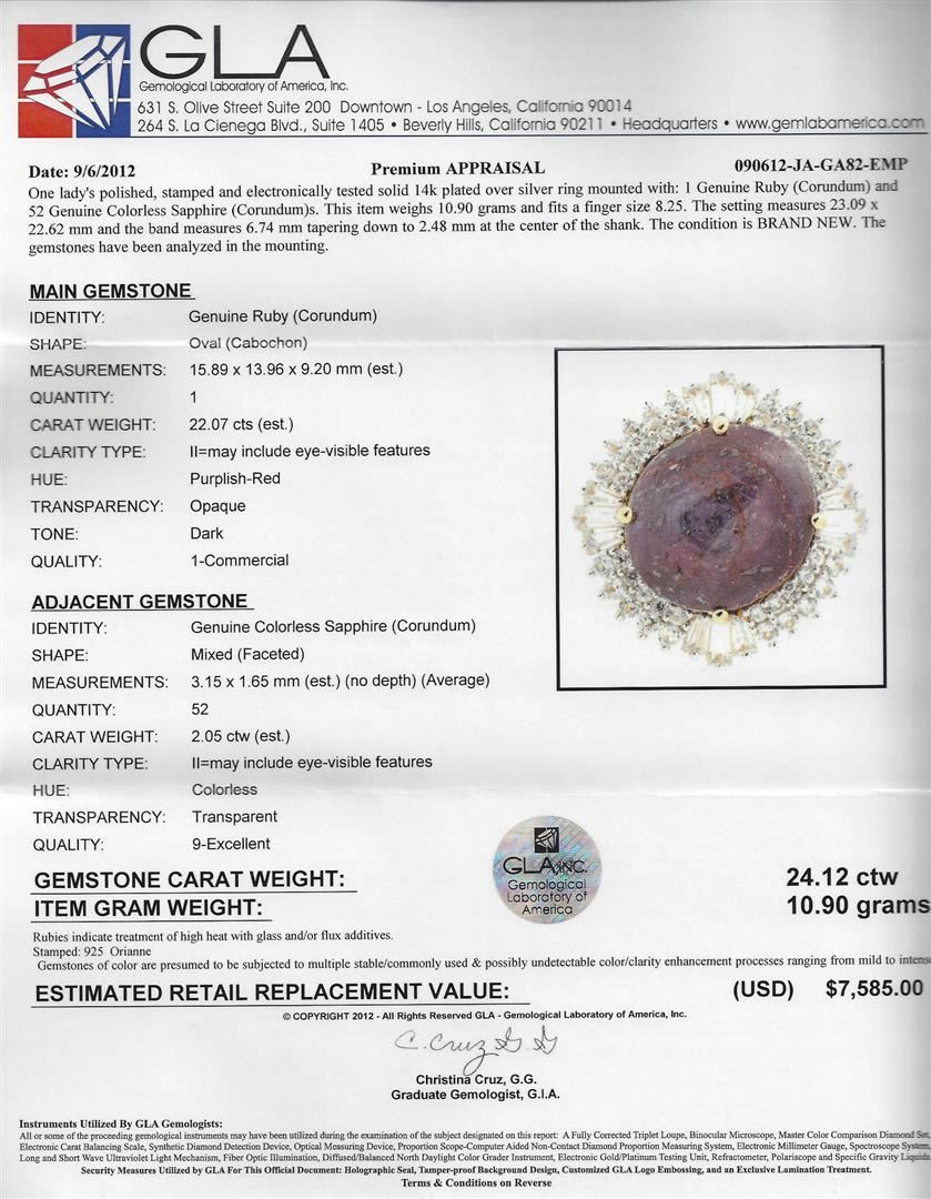 One lady's polished, stamped and electronically tested solid 14k plated over silver ring mounted with : 1 Genuine Ruby (Corundum) and 52 Genuine Colorless Sapphire (Corundum)s. This item weighs 10.90 grams and fits a finger size 8.25. The setting measures 23.09 x 22.62 mm and the band measures 6.74 mm tapering down to 2.48 mm at the center of the shank. The condition is BRAND NEW. The gemstones have been analyzed in the mounting. MAIN GEMSTONE: Identity: Genuine Ruby (Corundum). Shape: Oval (Cabochon). Measurements: 15.89 x 13.96 x 9.20 mm (est.). Quantity: 1. Carat Weight: 22.07 cts (est.). Clarity Type: II=may include eye-visible features. Hue: Purplish-Red. Transparency: Opaque. Tone: Dark. Quality: 1-Commercial. ADJACENT GEMSTONE: Identity: Genuine Colorless Sapphire (Corundum). Shape: Mixed (Faceted). Measurements: 3.15 x 1.65 mm (est.) (no depth) (Average). Quantity: 52. Carat Weight: 2.05 ctw (est.). Clarity Type: II=may include eye-visible features. Hue: Colorless. Transparency: Transparent. Quality: 9-Excellent. GEMSTONE CARAT WEIGHT: 24.12 ctw. ITEM GRAM WEIGHT: 10.90 grams. GLA Appraised at $7,585.00.