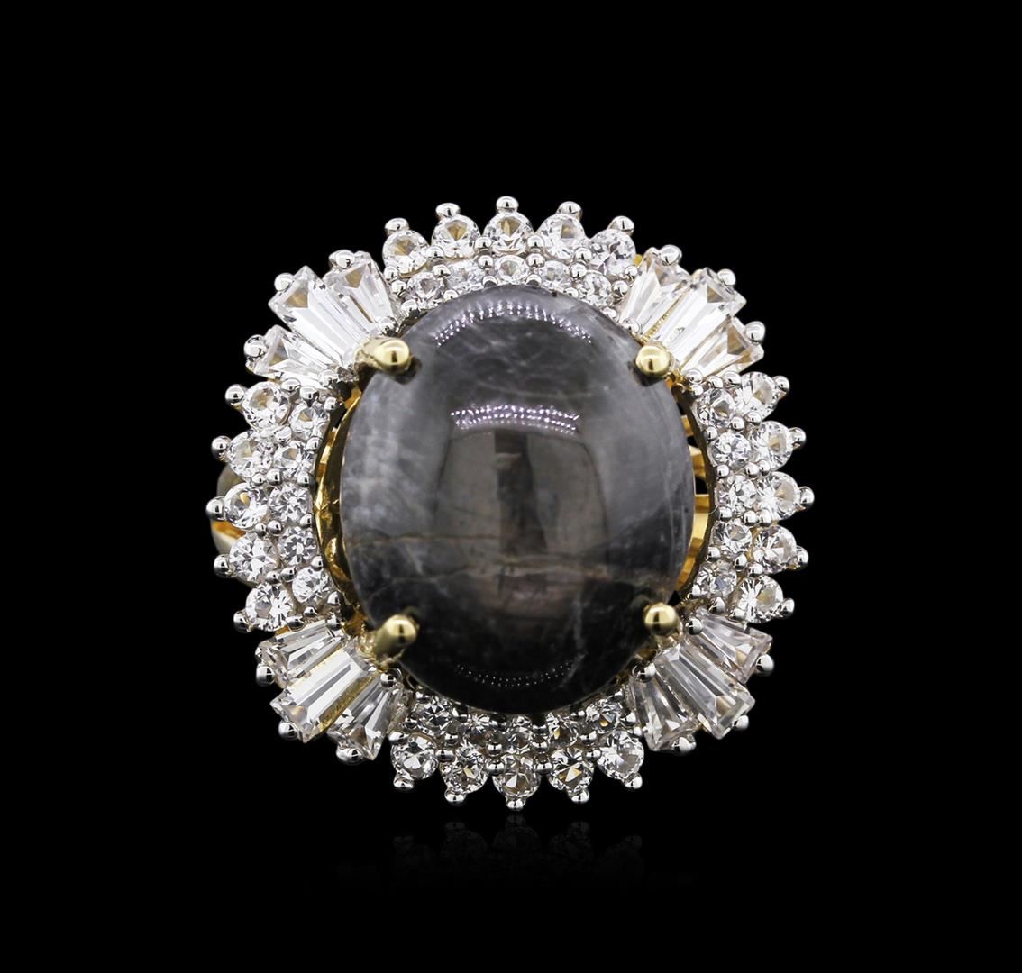 One lady's polished, stamped and electronically tested solid 14k plated over silver ring mounted with : 1 Genuine Ruby (Corundum) and 56 Genuine Colorless Sapphire (Corundum)s. This item weighs 11.20 grams and fits a finger size 8.25. The setting measures 23.03 x 22.75 mm and the band measures 3.15 mm tapering down to 1.65 mm at the center of the shank. The condition is BRAND NEW. The gemstones have been analyzed in the mounting. MAIN GEMSTONE: Identity: Genuine Ruby (Corundum). Shape: Oval (Cabochon). Measurements: 15.91 x 13.09 x 10.71 mm (est.). Quantity: 1. Carat Weight: 22.09 cts (est.). Clarity Type: II=may include eye-visible features. Hue: Brownish-Red. Transparency: Opaque. Tone: Dark. Quality: 2-Commercial to Fair. ADJACENT GEMSTONE: Identity: Genuine Colorless Sapphire (Corundum). Shape: Mixed (Faceted). Measurements: 3.15 x 1.65 mm (est.) (no depth) (Average). Quantity: 56 (est.). Carat Weight: 2.05 ctw (est.). Clarity Type: II=may include eye-visible features. Hue: Colorless. Transparency: Transparent. Quality: 9-Excellent. GEMSTONE CARAT WEIGHT: 24.14 ctw. ITEM GRAM WEIGHT: 11.20 grams. GLA Appraised at $9,864.00.