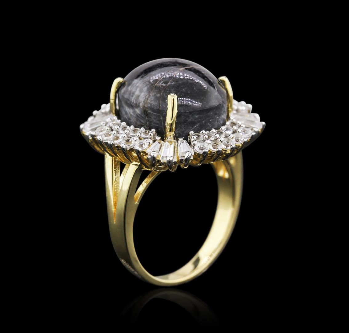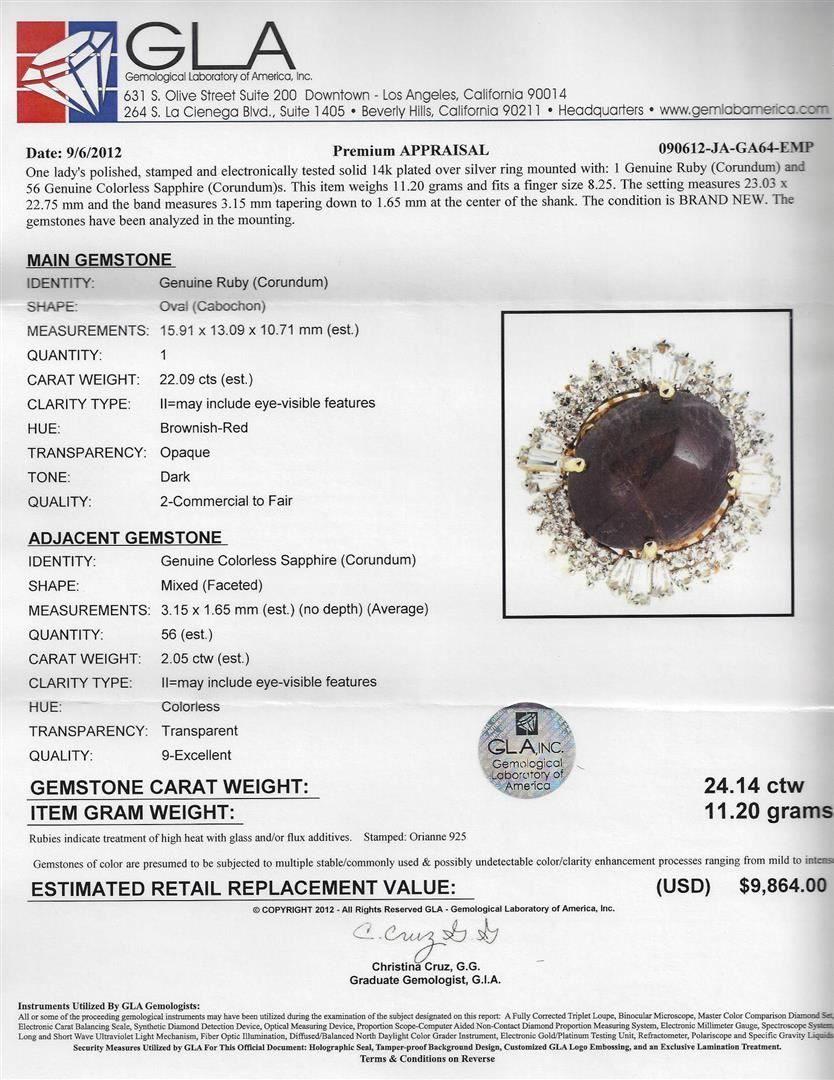 One lady's polished, stamped and electronically tested solid 14k plated over silver ring mounted with : 1 Genuine Ruby (Corundum) and 56 Genuine Colorless Sapphire (Corundum)s. This item weighs 11.20 grams and fits a finger size 8.25. The setting measures 23.03 x 22.75 mm and the band measures 3.15 mm tapering down to 1.65 mm at the center of the shank. The condition is BRAND NEW. The gemstones have been analyzed in the mounting. MAIN GEMSTONE: Identity: Genuine Ruby (Corundum). Shape: Oval (Cabochon). Measurements: 15.91 x 13.09 x 10.71 mm (est.). Quantity: 1. Carat Weight: 22.09 cts (est.). Clarity Type: II=may include eye-visible features. Hue: Brownish-Red. Transparency: Opaque. Tone: Dark. Quality: 2-Commercial to Fair. ADJACENT GEMSTONE: Identity: Genuine Colorless Sapphire (Corundum). Shape: Mixed (Faceted). Measurements: 3.15 x 1.65 mm (est.) (no depth) (Average). Quantity: 56 (est.). Carat Weight: 2.05 ctw (est.). Clarity Type: II=may include eye-visible features. Hue: Colorless. Transparency: Transparent. Quality: 9-Excellent. GEMSTONE CARAT WEIGHT: 24.14 ctw. ITEM GRAM WEIGHT: 11.20 grams. GLA Appraised at $9,864.00.