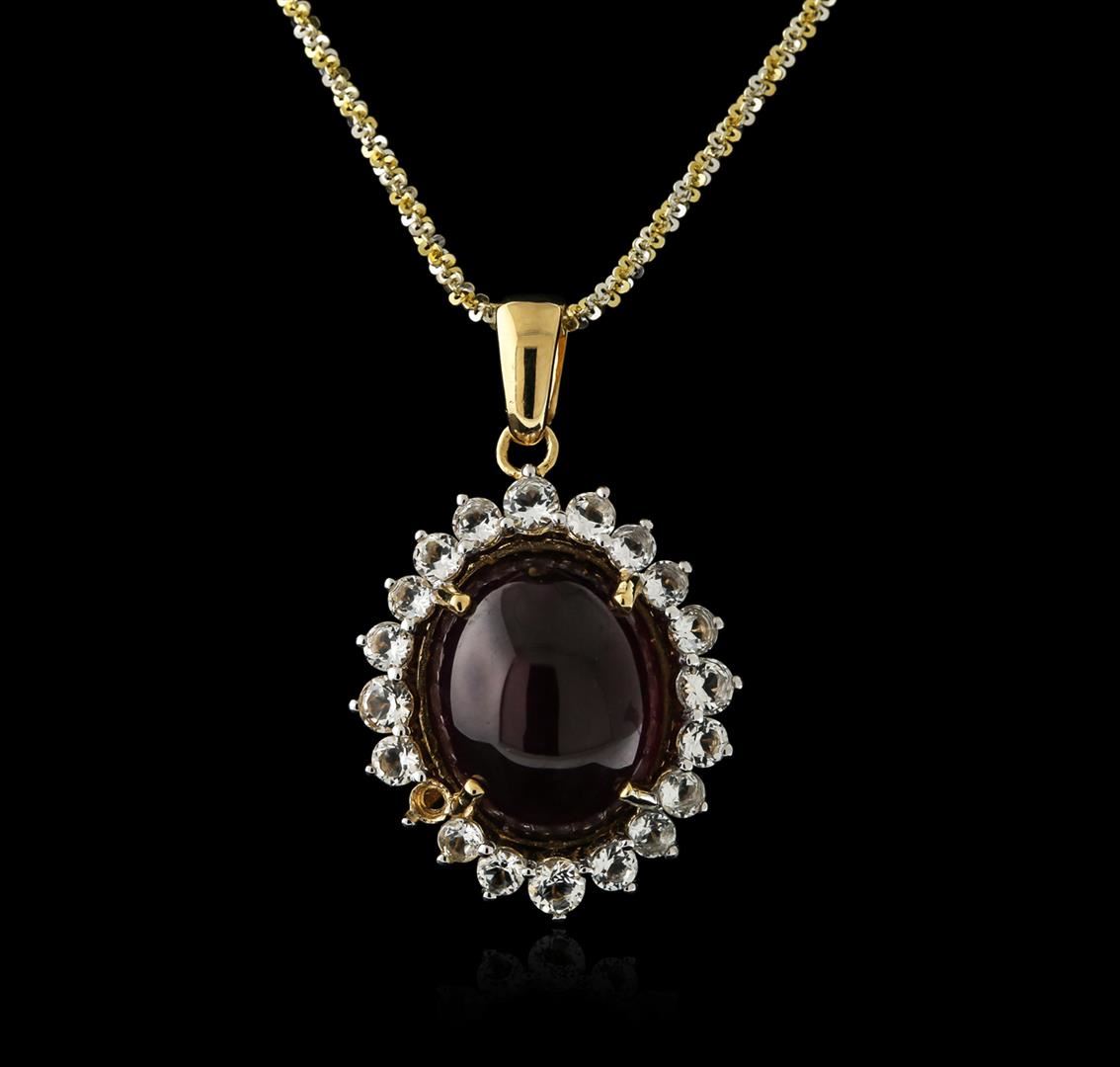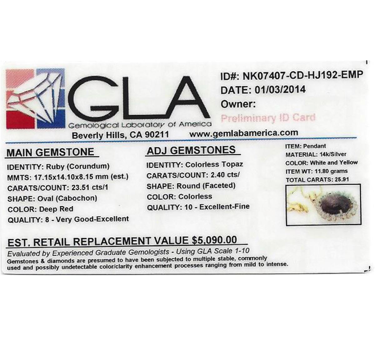 One pendant with chain featuring: 14K plated silver (white and yellow) weighing 11.80 grams containing one deep red oval (cabochon) ruby with a total weight of 23.51ct. Quality: 8 - Very Good-Excellent. Mmts: 17.15 x 14.10 x 8.15 mm (est.). And colorless round (faceted) topaz with a total weight of 2.40ct. Quality: 10 - Excellent-Fine. GLA Appraised at $5,090.00.