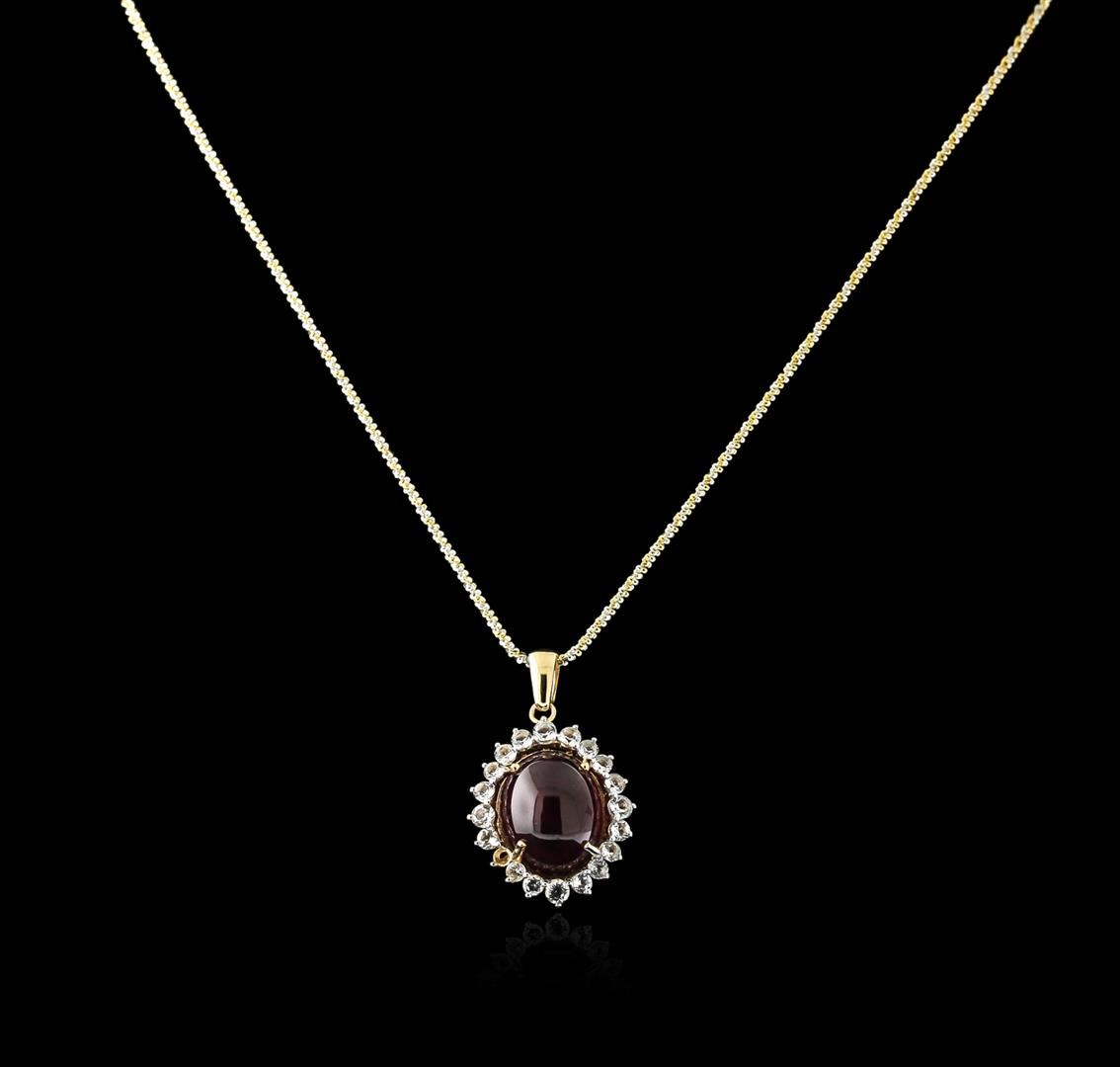 One pendant with chain featuring: 14K plated silver (white and yellow) weighing 11.80 grams containing one deep red oval (cabochon) ruby with a total weight of 23.51ct. Quality: 8 - Very Good-Excellent. Mmts: 17.15 x 14.10 x 8.15 mm (est.). And colorless round (faceted) topaz with a total weight of 2.40ct. Quality: 10 - Excellent-Fine. GLA Appraised at $5,090.00.