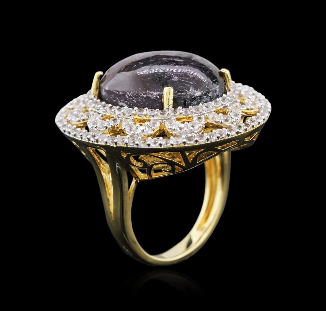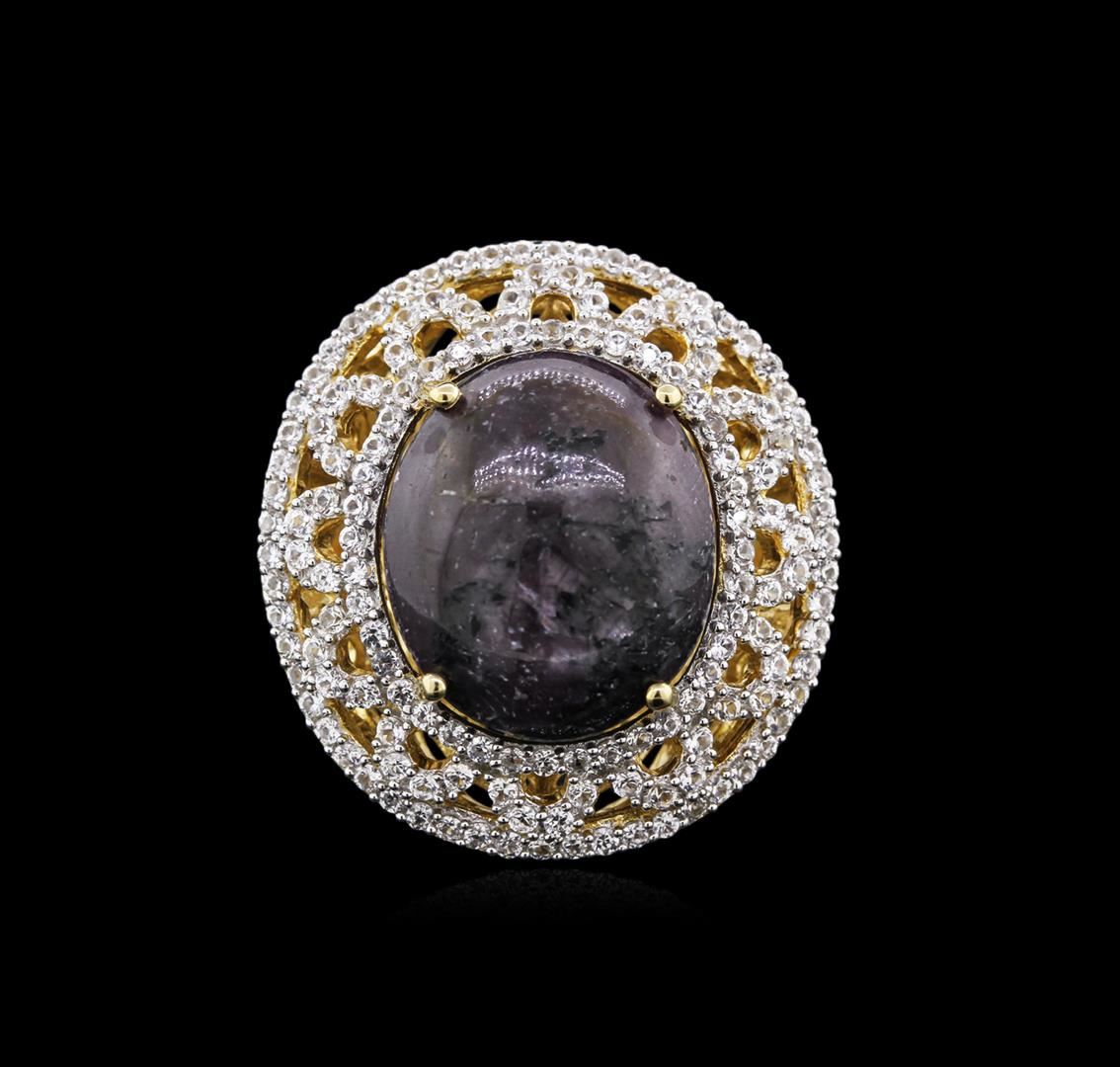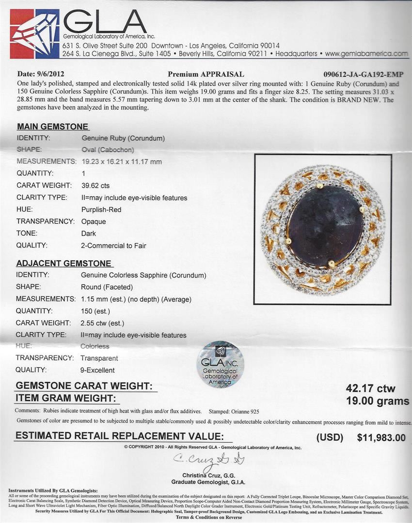 One lady's polished, stamped and electronically tested solid 14k plated over silver ring mounted with : 1 Genuine Ruby (Corundum) and 150 Genuine Colorless Sapphire (Corundum)s. This item weighs 19.00 grams and fits a finger size 8.25. The setting measures 31.03 x 28.85 mm and the band measures 5.57 mm tapering down to 3.01 mm at the center of the shank. The condition is BRAND NEW. The gemstones have been analyzed in the mounting. MAIN GEMSTONE: Identity: Genuine Ruby (Corundum). Shape: Oval (Cabochon). Measurements: 19.23 x 16.21 x 11.17 mm (est.). Quantity: 1. Carat Weight: 39.62 cts (est.). Clarity Type: II=may include eye-visible features. Hue: Purplish-Red. Transparency: Opaque. Tone: Dark. Quality: 2-Commercial to Fair. ADJACENT GEMSTONE: Identity: Genuine Colorless Sapphire (Corundum). Shape: Round (Faceted). Measurements: 1.15 mm (est.) (no depth) (Average). Quantity: 150 (est.). Carat Weight: 2.55 ctw (est.). Clarity Type: II=may include eye-visible features. Hue: Colorless. Transparency: Transparent. Quality: 9-Excellent. GEMSTONE CARAT WEIGHT: 42.17 ctw. ITEM GRAM WEIGHT: 19.00 grams. GLA Appraised at $11,983.00.