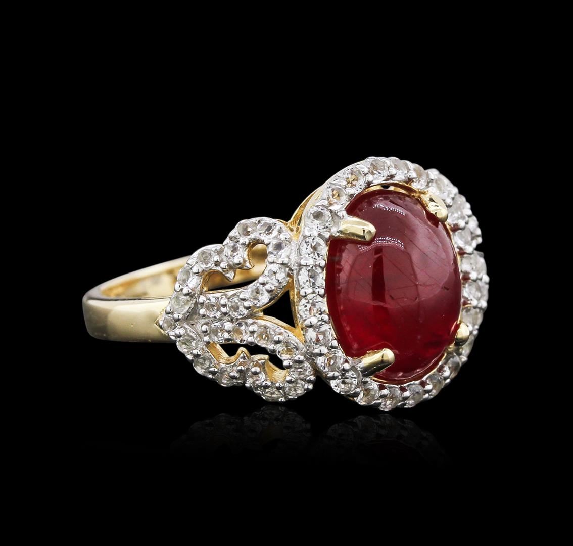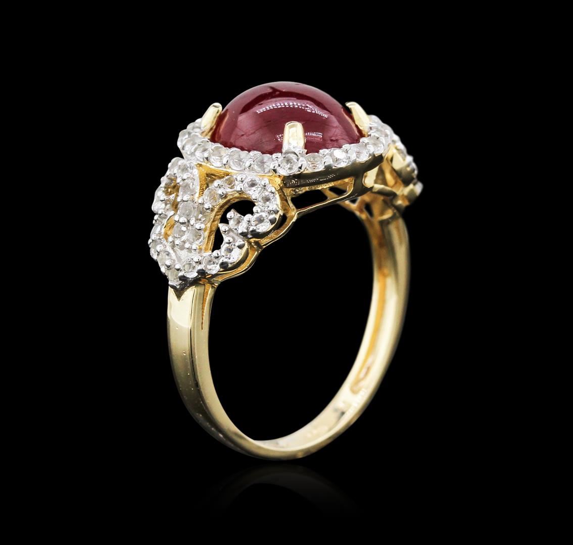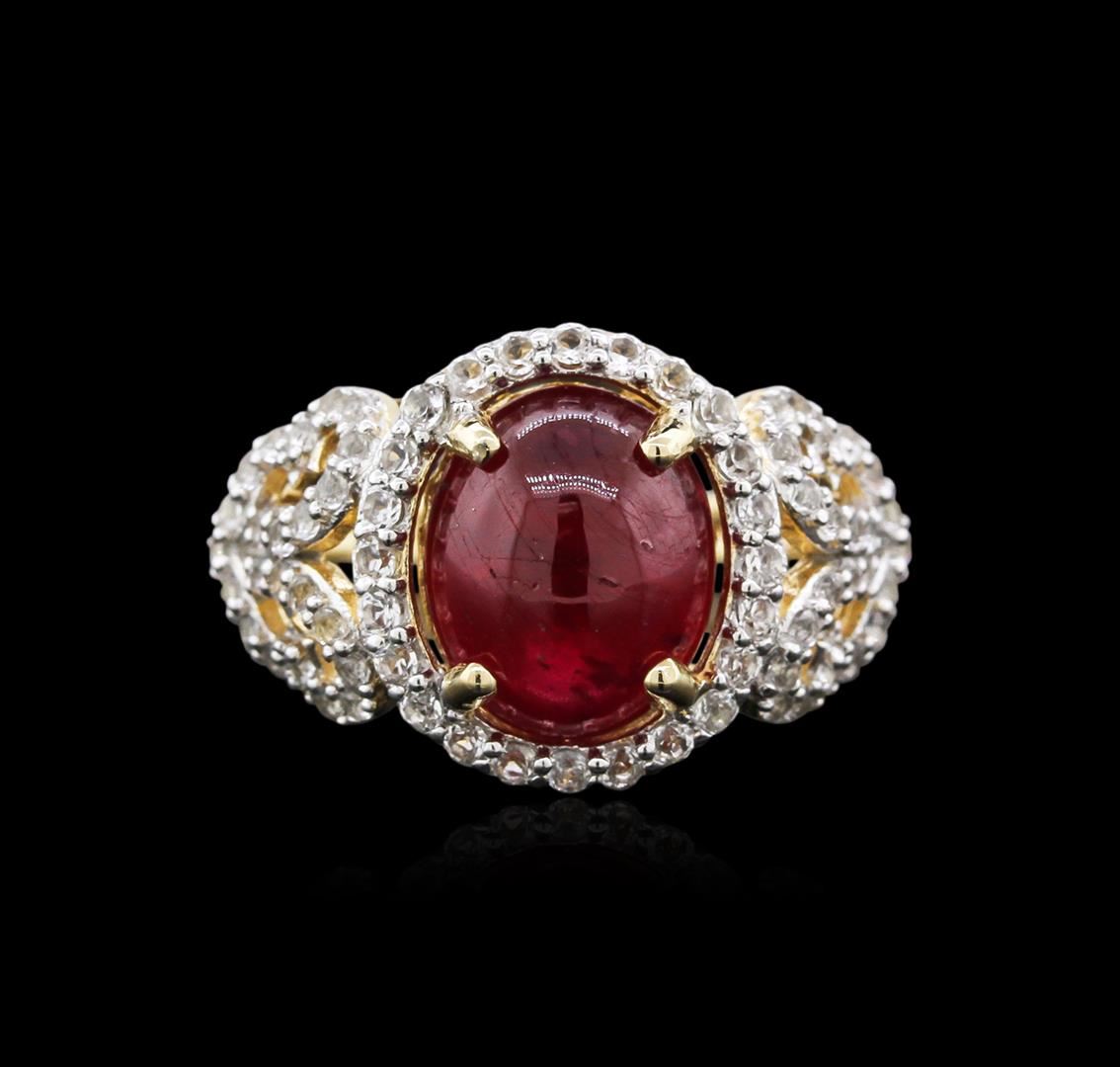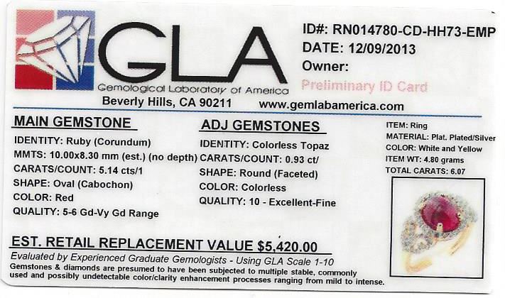 One ring featuring: platinum plated silver (white and yellow) weighing 4.80 grams containing one red oval (cabochon) ruby with a total weight of 5.14ct. Quality: 5-6 Gd-Vy Gd Range. Mmts: 10.00 x 8.30 mm (est.) (no depth). And colorless round (faceted) topaz with a total weight of 0.93ct. Quality: 10 - Excellent-Fine. GLA Appraised at $5,420.00.