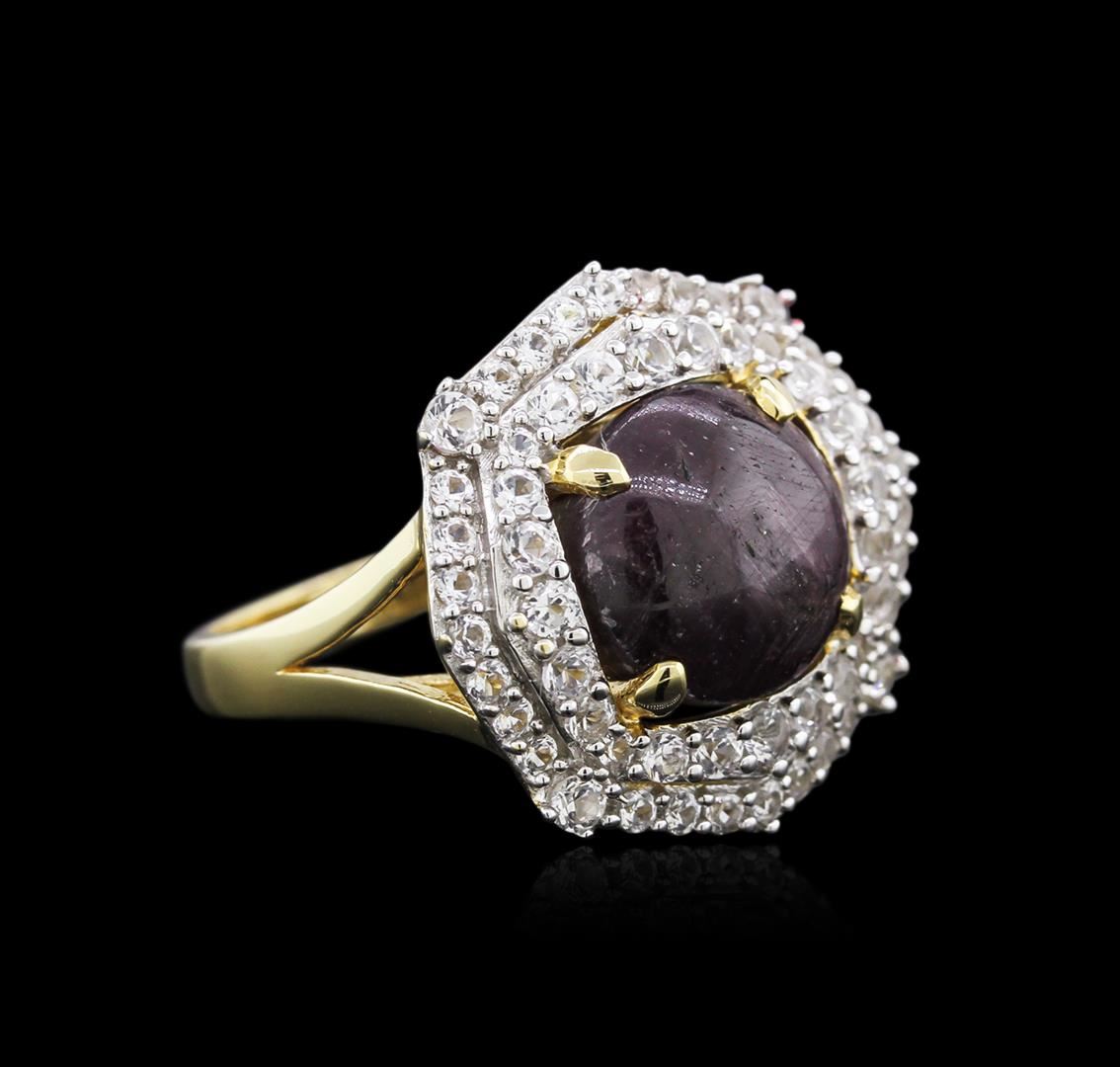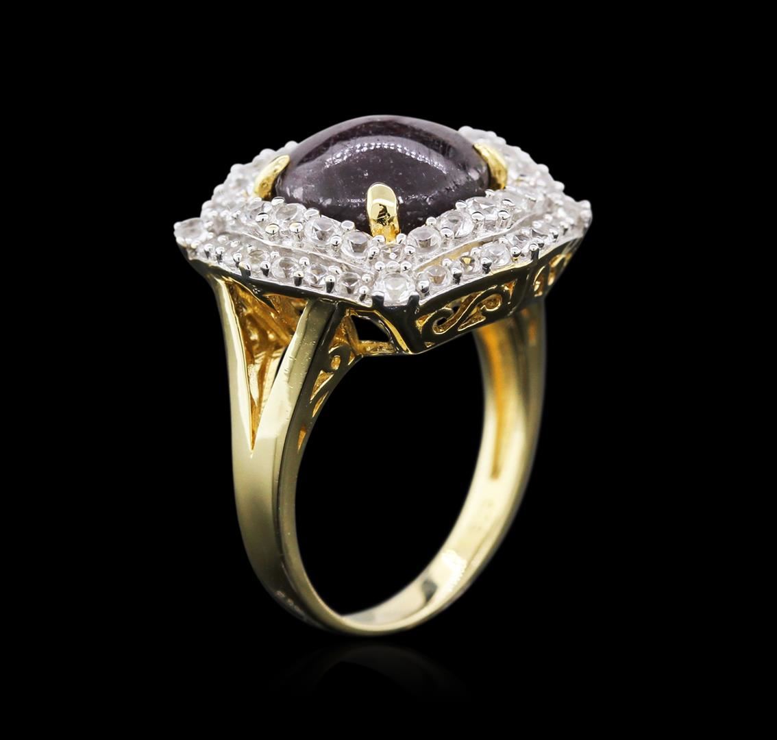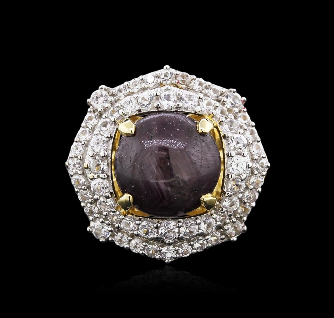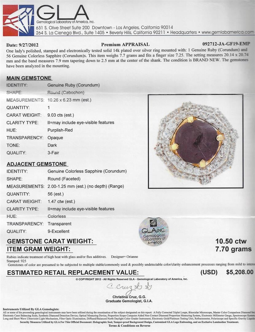 One lady's polished, stamped and electronically tested solid 14k plated over silver ring mounted with : 1 Genuine Ruby (Corundum) and 56 Genuine Colorless Sapphire (Corundum)s. This item weighs 7.7 grams and fits a finger size 7.25. The setting measures 20.14 x 20.74 mm and the band measures 7.9 mm tapering down to 2.5 mm at the center of the shank. The condition is BRAND NEW. The gemstones have been analyzed in the mounting. MAIN GEMSTONE: Identity: Genuine Ruby (Corundum). Shape: Round (Cabochon). Measurements: 10.26 x 6.23 mm (est.). Quantity: 1. Carat Weight: 9.03 cts (est.). Clarity Type: II=may include eye-visible features. Hue: Purplish-Red. Transparency: Opaque. Tone: Dark. Quality: 3-Fair. ADJACENT GEMSTONE: Identity: Genuine Colorless Sapphire (Corundum). Shape: Round (Faceted). Measurements: 2.00-1.25 mm (est.) (no depth) (Range). Quantity: 56 (est.). Carat Weight: 1.47 ctw (est.). Clarity Type: II=may include eye-visible features. Hue: Colorless. Transparency: Transparent. Quality: 9-Excellent. GEMSTONE CARAT WEIGHT: 10.50 ctw. ITEM GRAM WEIGHT: 7.70 grams. GLA Appraised at $5,208.00.