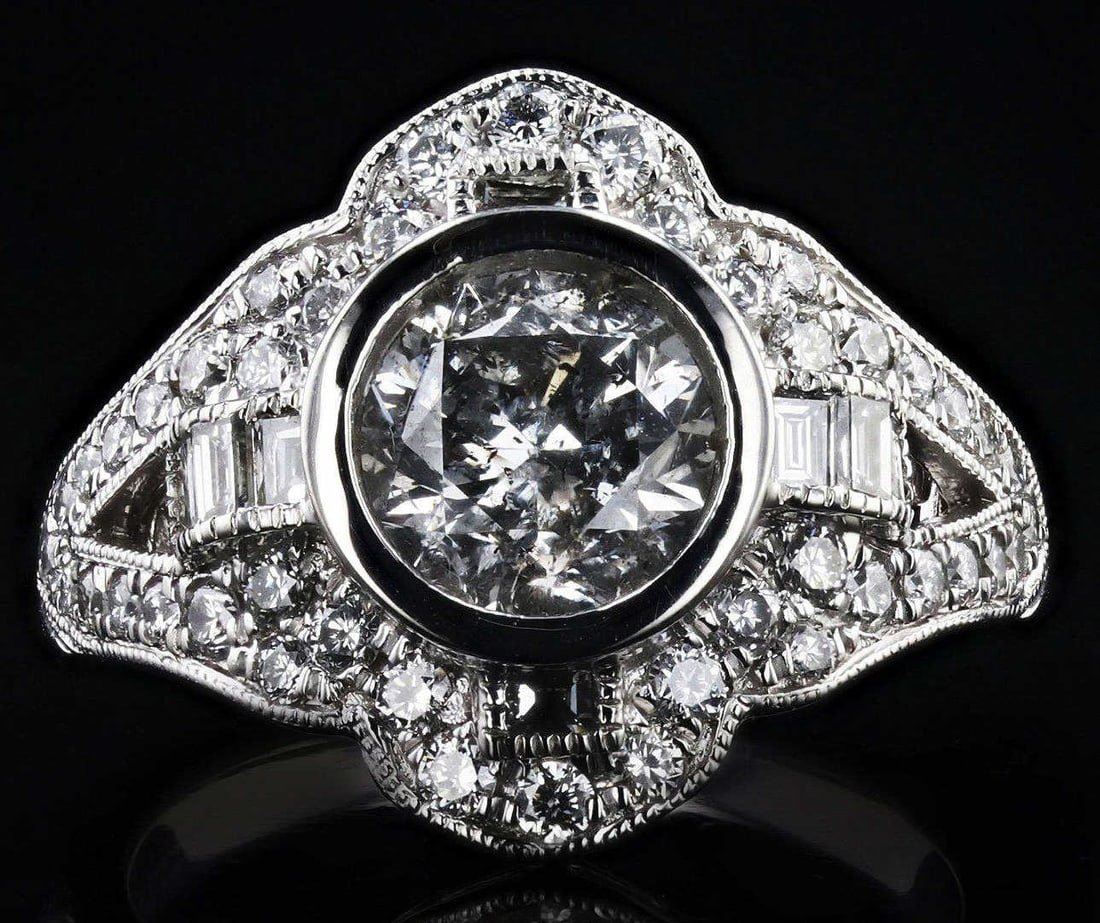 Platinum Diamond Ring One polished, stamped, and tested platinum ring marked Sheffield & Sons. The ring is mounted with 1 genuine diamond center stone weighing approximately 1.49 carat, and 54 genuinefaceted diamonds weighing approximately 0.96 carats. This item weighs 11.1 grams, condition is new, excellent workmanship. *MAIN GEMSTONE* Identity: Natural Diamond Shape: Round Cutting Style: Brilliant CutMeasurements: 7.2mm Weight: 1.49 carat Color Grade: H Clarity Grade: I1 Cut Grade: Very Good Refractive Index: 2.418 Hardness: 10 *ADJACENT GEMSTONES ON RING* Identity: Natural Diamond Shape & Cutting Style:Baguette / Round Brilliant Quantity: 54 Diamonds Measurements: 1.5 - 2.0mm (8 baguette), 1.3 - 1.7mm (46 round) Total Weight: 0.96 carats Color Grade: F - G Clarity Grade: VS1 - VS2 Refractive Index:2.418 Hardness: 10