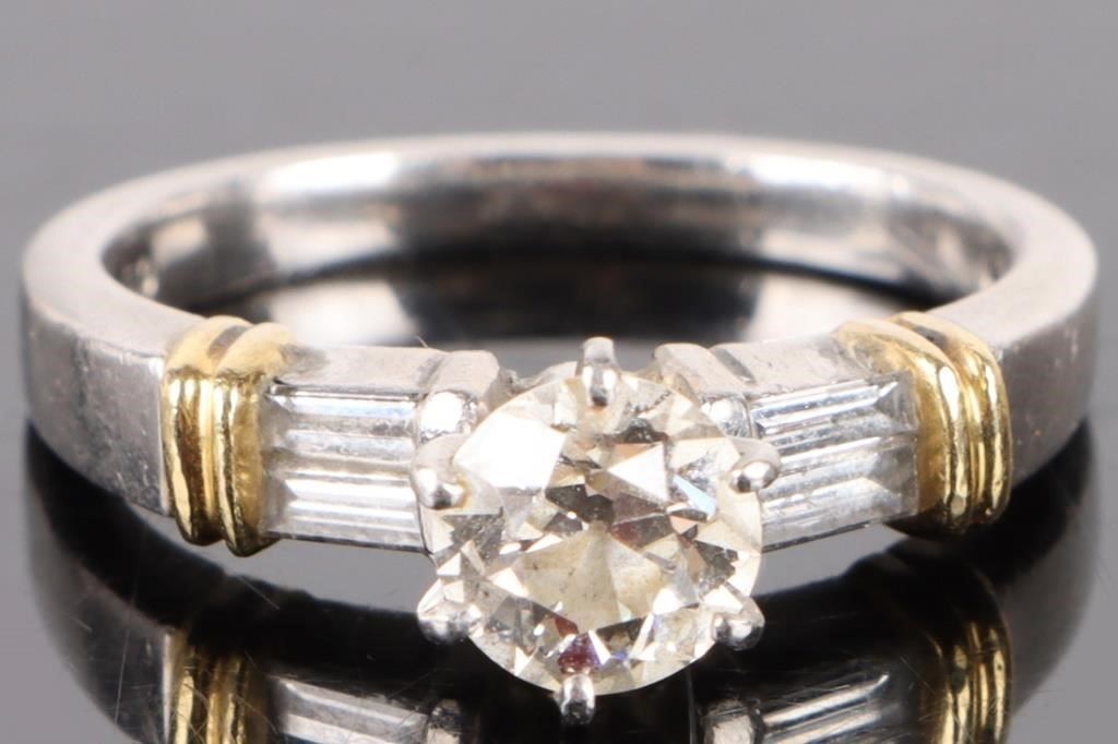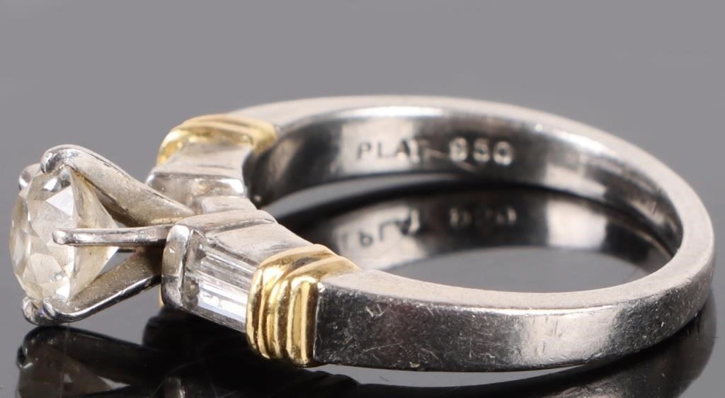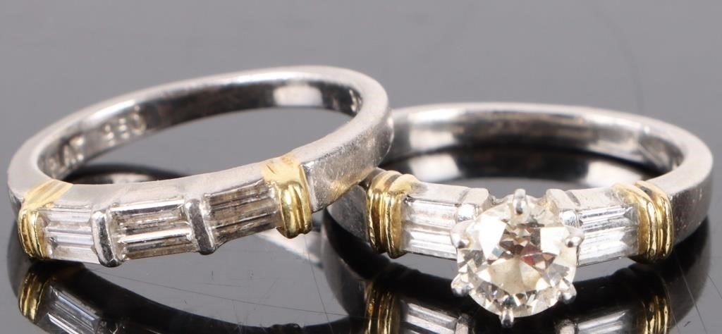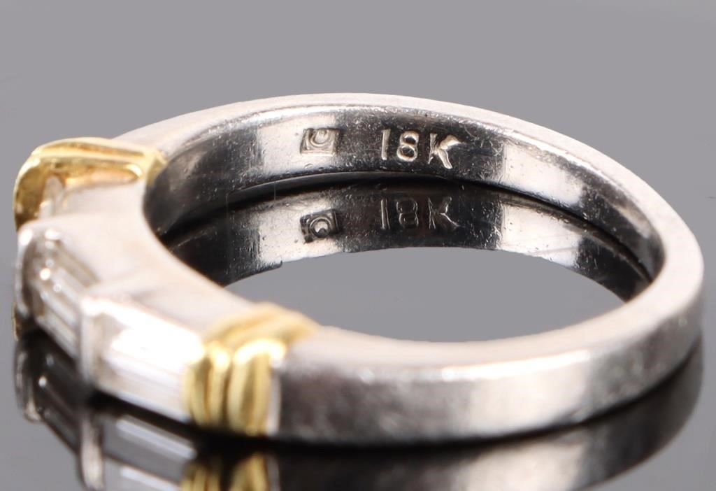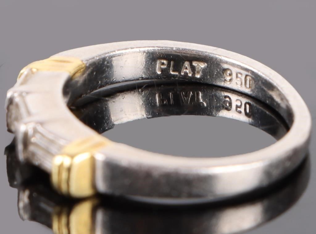 Platinum & amp; 18K gold Maier & amp; Berkele diamond ladies wedding ring set. Wedding set includes one band w/ six 0.15ct baguette cut diamonds, and one ring w/ four 0.15ct baguette cut diamonds and one 0.75ct round cut diamond headstone.