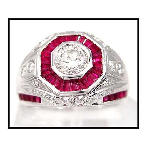 This heavy (13.80 grams) platinum ring was commissioned by the director of The San Francisco Jewelry Museum for exhibition. 45 superb natural rubies and 26 diamonds are perfect accents for the .70 carat center stone. It is I color and I1 clarity because of a white internal inclusion. Without the white inclusion clarity grade would be higher. Attractive! Museum valued the mounting only for $2950, plus the center stone, which had been donated to the museum. A great buyer opportunity. Size 6 1/2.