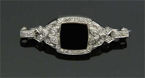 PLATINUM AND DIAMOND BROOCH. Converted watch is made into an attractive brooch having a central black onyx center and .50ct tw diamond melees. SIZE: 1-1/2” l. CONDITION: Very good. 9-27257