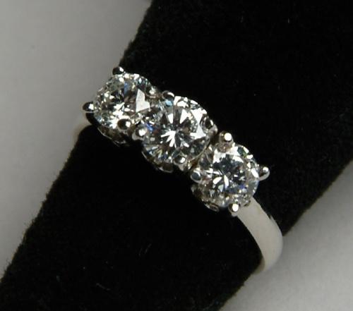 PLATINUM AND DIAMOND RING. Lovely platinum setting is mounted with three round brilliant cut diamonds mounted side by side. Total weight of diamonds is approx. 1.30ct. Center diamond is approx. 5mm dia and side diamonds are approx. 4.6mm dia. SIZE: 6. CONDITION: Very good to excellent. 5-61204