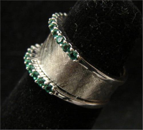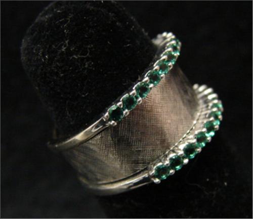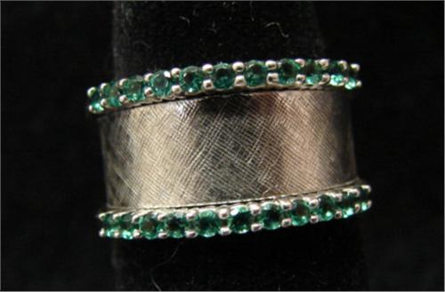 PLATINUM BAND. Enclosed with two white gold bands with green stones on both sides.