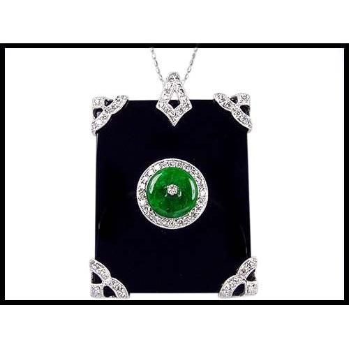 This remarkable platinum, onyx, jade and diamond pendant is an art deco design masterpiece. 67 round cut sparkling diamonds of nice color and quality, and a fine color natural precious jade are set within polished onyx. This stunning pendant measures 37mm ( 1 7/16") x 25mm (1") . Good luck to you if you think you can find a platinum pendant like this for less than about $3,000.00.