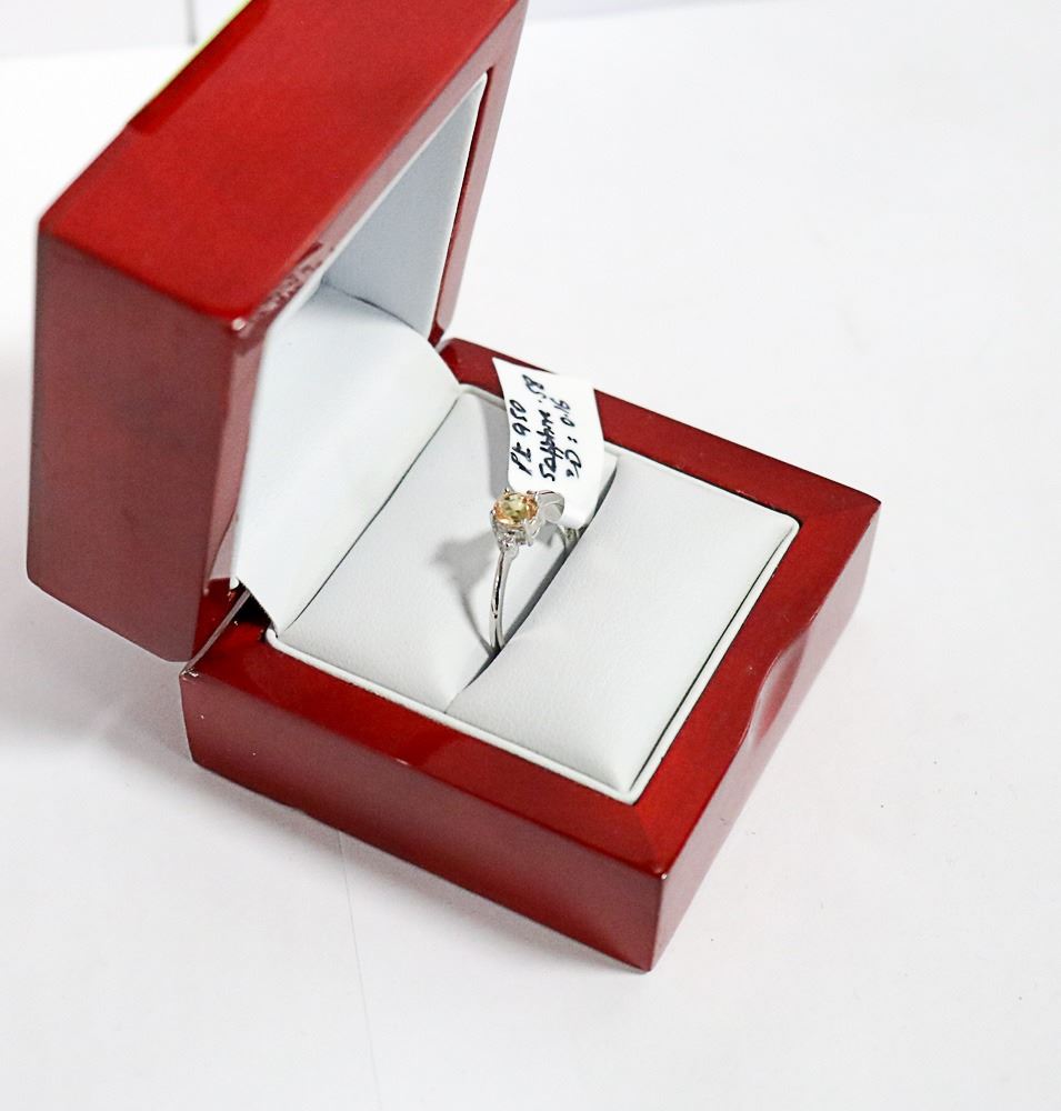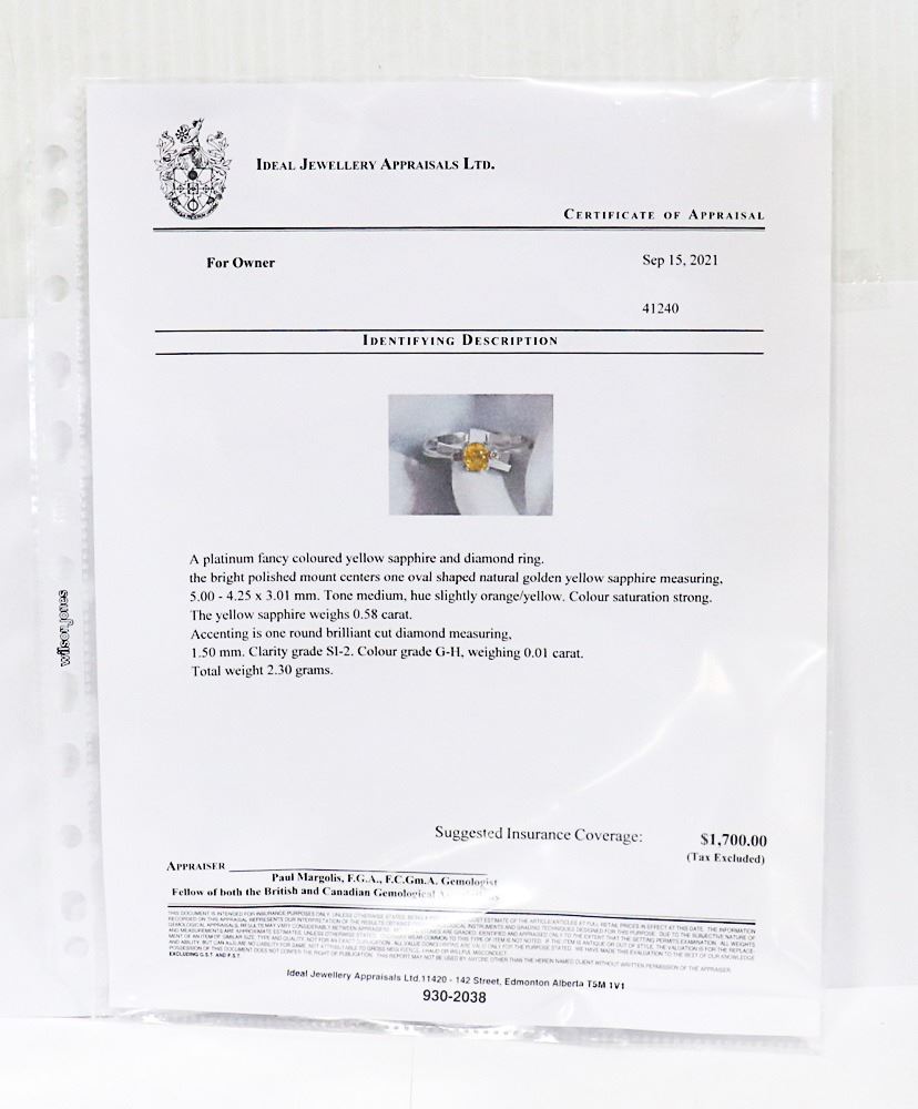 FANCY COLOURED YELLOW SAPPHIRE. THE BRIGHT POLISHED MOUNT CENTERS ONE OVAL SHAPED NATURAL GOLDEN YELLOW SAPPHIRE MEASURING, 5.00 - 4.25 X 3.01MM. TONE MEDIUM, HUE SLIGHTLY ORANGE/YELLOW. COLOUR SATURATION STRONG. THE YELLOW SAPPIREWEIGHS 0.58 CARAT. ACCENTING IS ONE ROUND BRILLIANT CUT DIAMOND MEASURING, 1.50MM. CLARITY GRADE SI-2. COLOUR GRADE G-H, WEIGHING 0.01 CARAT. TOTAL WEIGHT 2.30 GRAMS. SUGGESTED INSURANCE COVERAGE $1700.00