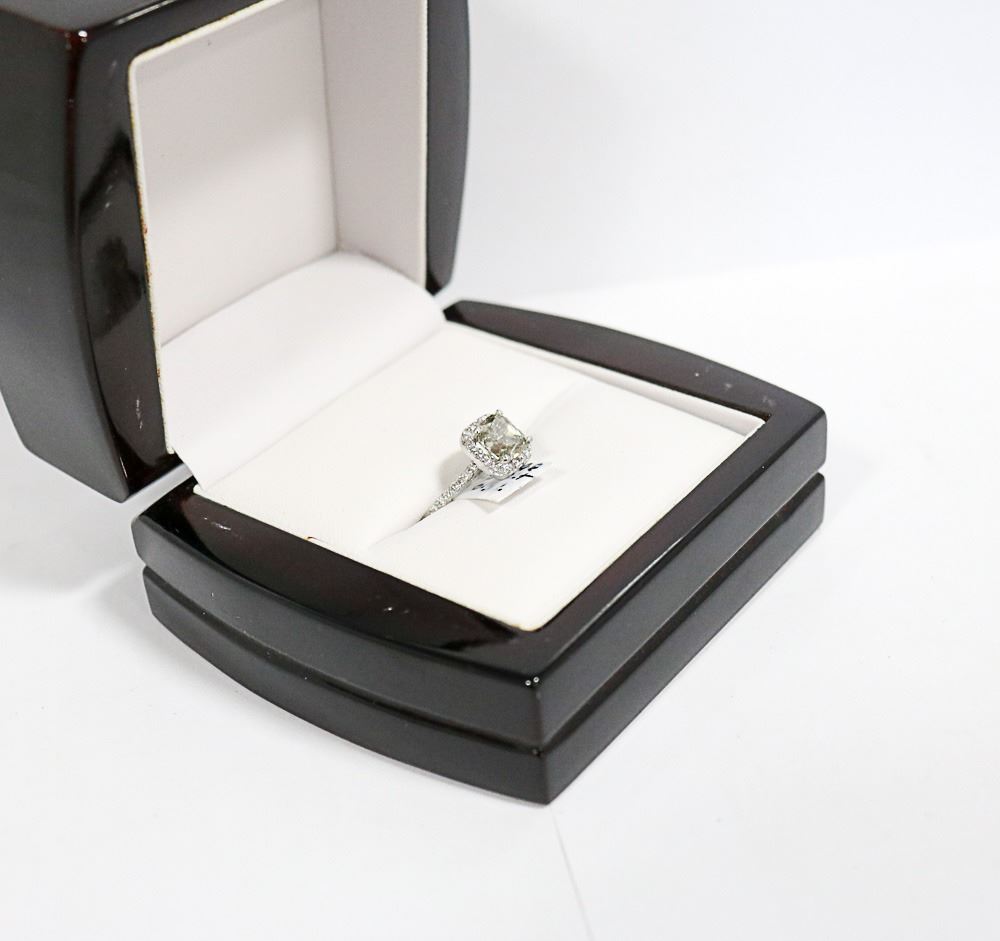 A SIZE: 6 1/4 - PLATINUM FANCY CUT AND COLOURED DIAMOND RING. THE BRIGHT POLISHED HALO STYLE MOUNT WITH DIAMOND SET SHOULDERS CENTERS A FOUR PRONG SET, CUSHION CUT DIAMOND MEASURING, 7.07 - 6.80 X 4.70MM. HUE GRAYISH/YELLOWISH/BROWNISH/GREEN.CLARITY GRADE I-1. POLISH AND SYMMETRY GOOD. CARAT WEIGHT APPROXIMATELY, 2.02 CARATS. THE SURROUND AND SHOULDERS OF THE MOUNT ARE SET WITH, 34 ROUND BRILLIANT CUT DIAMONDS MEASURING, 1.30MM. CLARITY GRADE I-1. COLOUR GRADE G-H., WEIGHING IN TOTAL0.35 CARAT. TOTAL WEIGHT 4.80 GRAMS. SUGGESTED INSURANCE COVERAGE: $12000.00.
