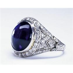 PLATINUM FILIGREE RING, bezel set with an oval synthetic sapphire cabochon in a mount decorated with 71 various small round cut diamonds, 2 diamonds missing