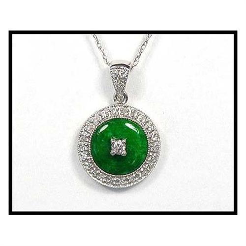 This Art Deco style solid platinum pendant is in perfect condition. The outer border is set with 26 white diamonds. Vivid green, precious natural jade is NOT a dyed stone. B enhanced for permanent beauty. Was fairly priced for $950. No chain. Measures 20mm (3/4") x 13mm (1/2") with bale.