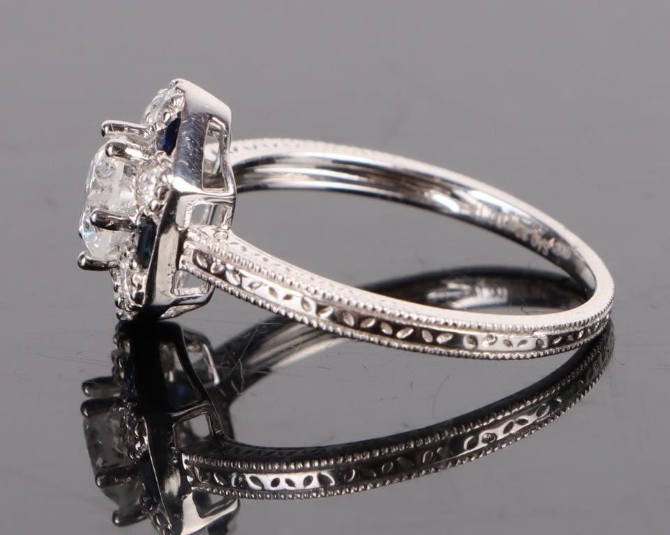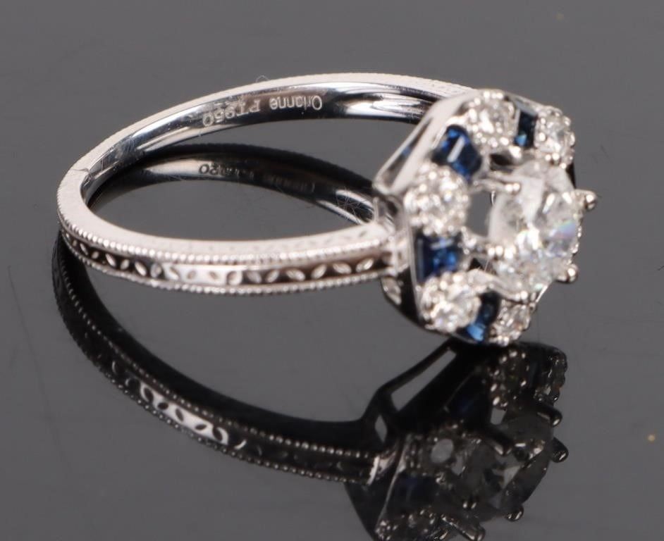 Platinum natural diamond sapphire ladies ring to include one 0.65CT round cut I1/I2 natural diamond center stone, six 0.03CT round cut SI natural diamonds, and six 0.053CT square cut fine dark blue natural sapphire gemstones.