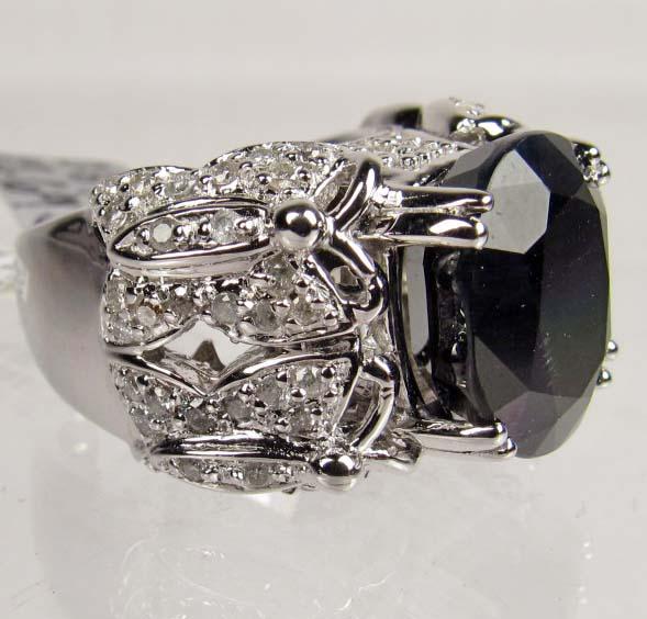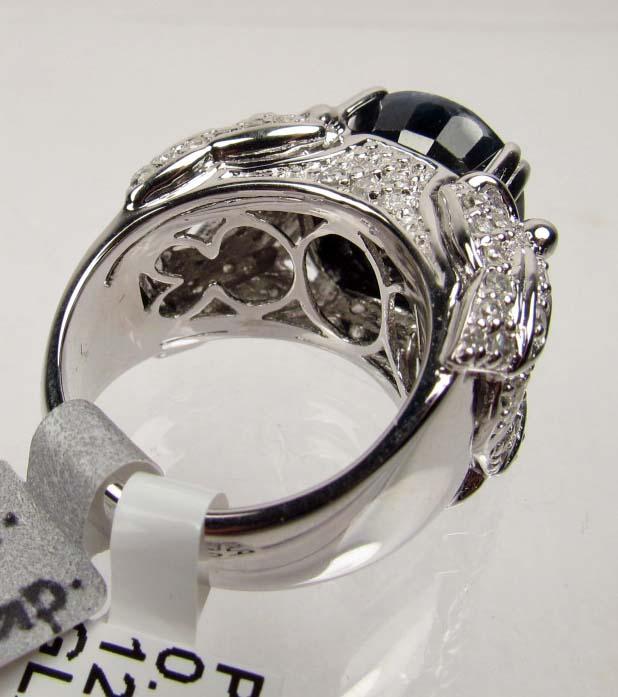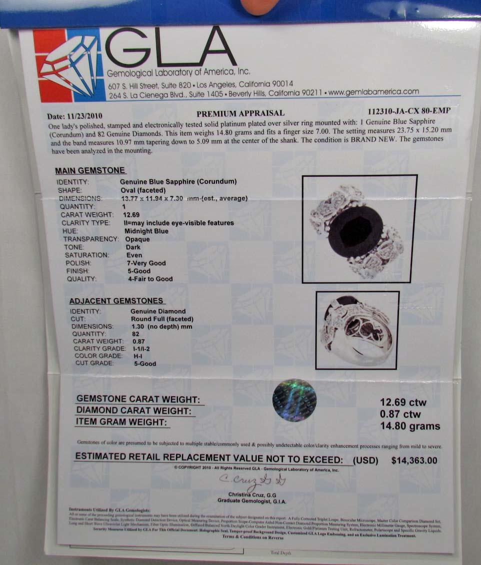 PLATINUM OVER SILVER LADIES SAPPHIRE AND DIAMOND RING - SIZE 7 - Comes w/ GLA Appraisal of $14,363.00. One oval cut Blue Sapphire center stone. 82 round full cut Diamonds. Sapphire 12.69ct., Diamonds 0.87ct., Total Weight 14.80 grams.