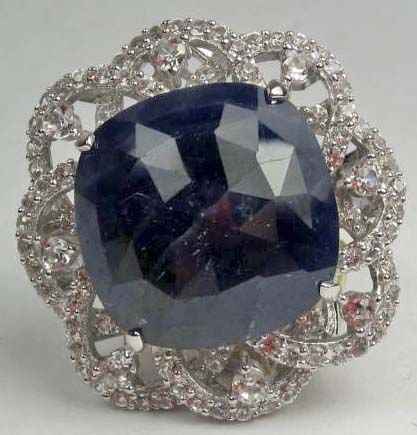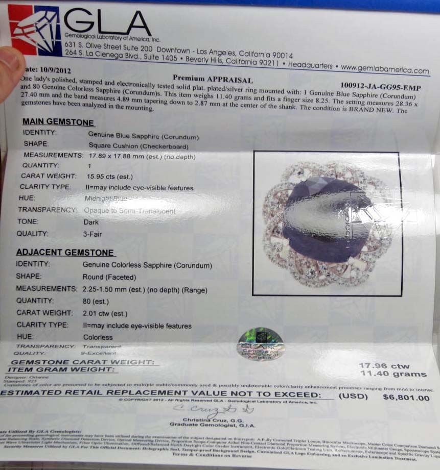 Comes w/ GLA Appraisal of $6,801.00. One square cushion Blue Sapphire center stone. 80 round colorless Sapphires. Sapphires 17.96 cts, Total Weight 11.40 grams.