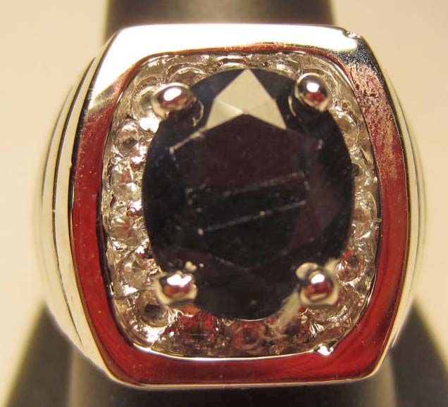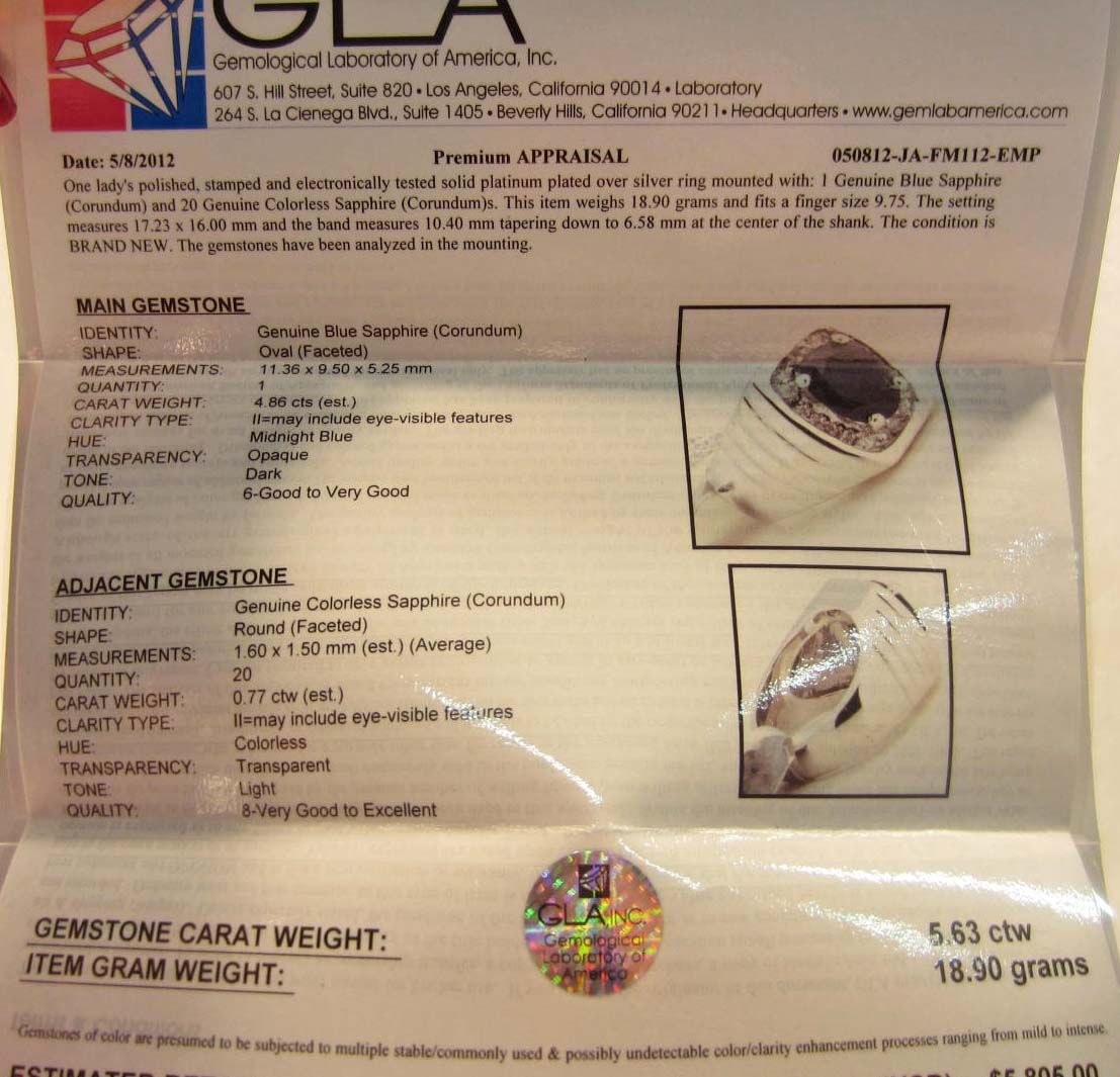 Comes w/ GLA Appraisal of $5,805.00. One oval Blue Sapphire center stone. 20 round colorless Sapphires. Sapphires 5.63 cts, Total Weight 18.90 grams.