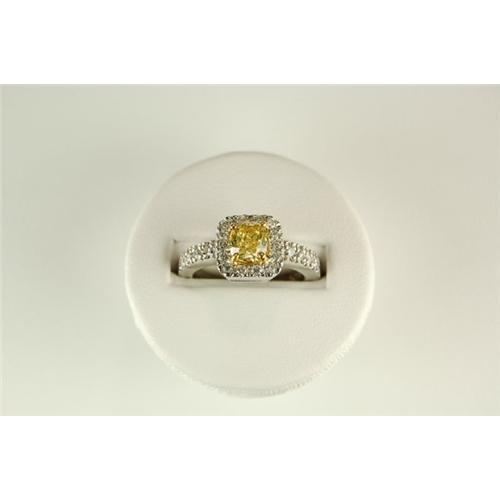 This magnificent Estate ring is PLATINUM and it features a NATURAL FANCY YELLOW DIAMOND, also called a CANARY DIAMOND. This YELLOW DIAMOND is CUSHION CUT and it weighs 1.03 CARATS! It has a GIA Certificate that Certifies it as being 'NATURAL FANCY YELLOW' in color. The CANARY DIAMOND is surrounded by magnficient WHITE DIAMONDS and their Total Weight = .37 Carats! These White Diamonds are all well matched and FINE 'VS' Quality and FINE 'F' Color. The DIAMOND TOTAL WEIGHT of the RING = 1.40 CARATS! This ring is a Size 6 1/4 and it can be resized.