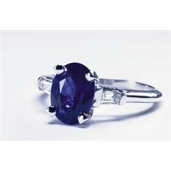 PLATINUM RING, set with a fine oval cut sapphire (approx. 2.50ct.) flanked by 2 small tapered baguette cut diamonds