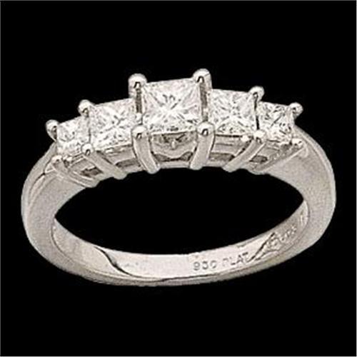 Platinum Anniversary Wedding Band featuring 5 Princess Cut Diamonds with a Total Weight = .75 CARATS! The Diamonds are all sparkling, 'SI2' Clarity and Fine 'H' Color. This Platinum Wedding Band is a size 7 and I can resize it for you.