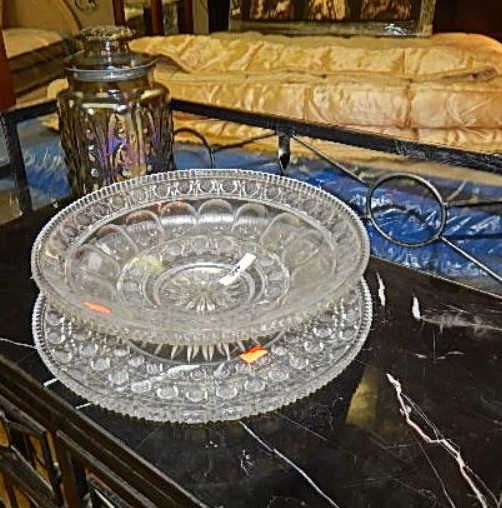 PLATTER, BOWL & CARVIVAL COLORED JAR WITH LID