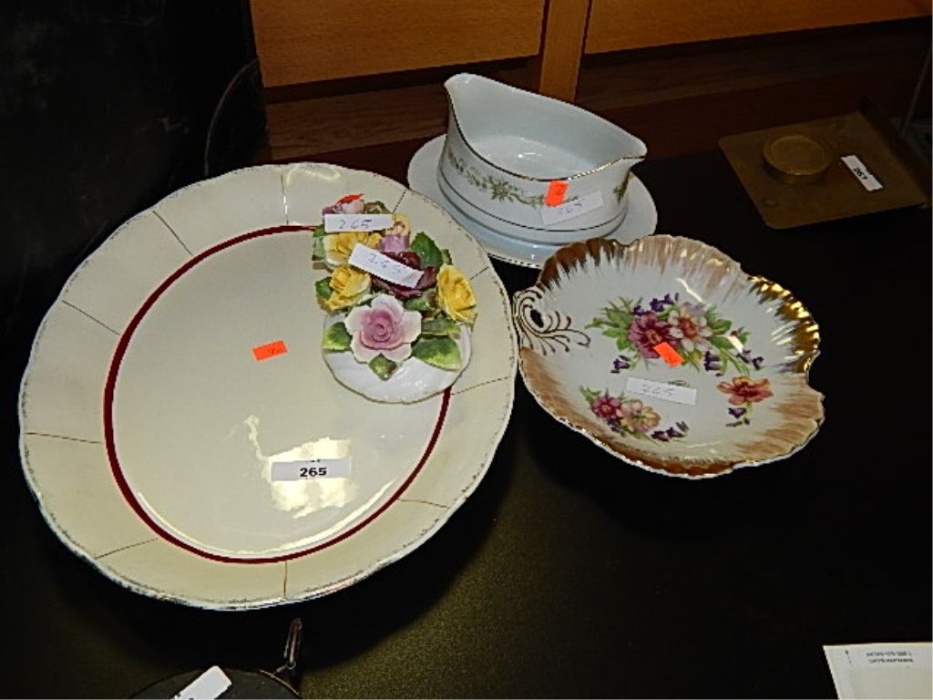 PLATTER, GRAVY BOAT & 2 CHINA FLOWERS (ENGLAND)