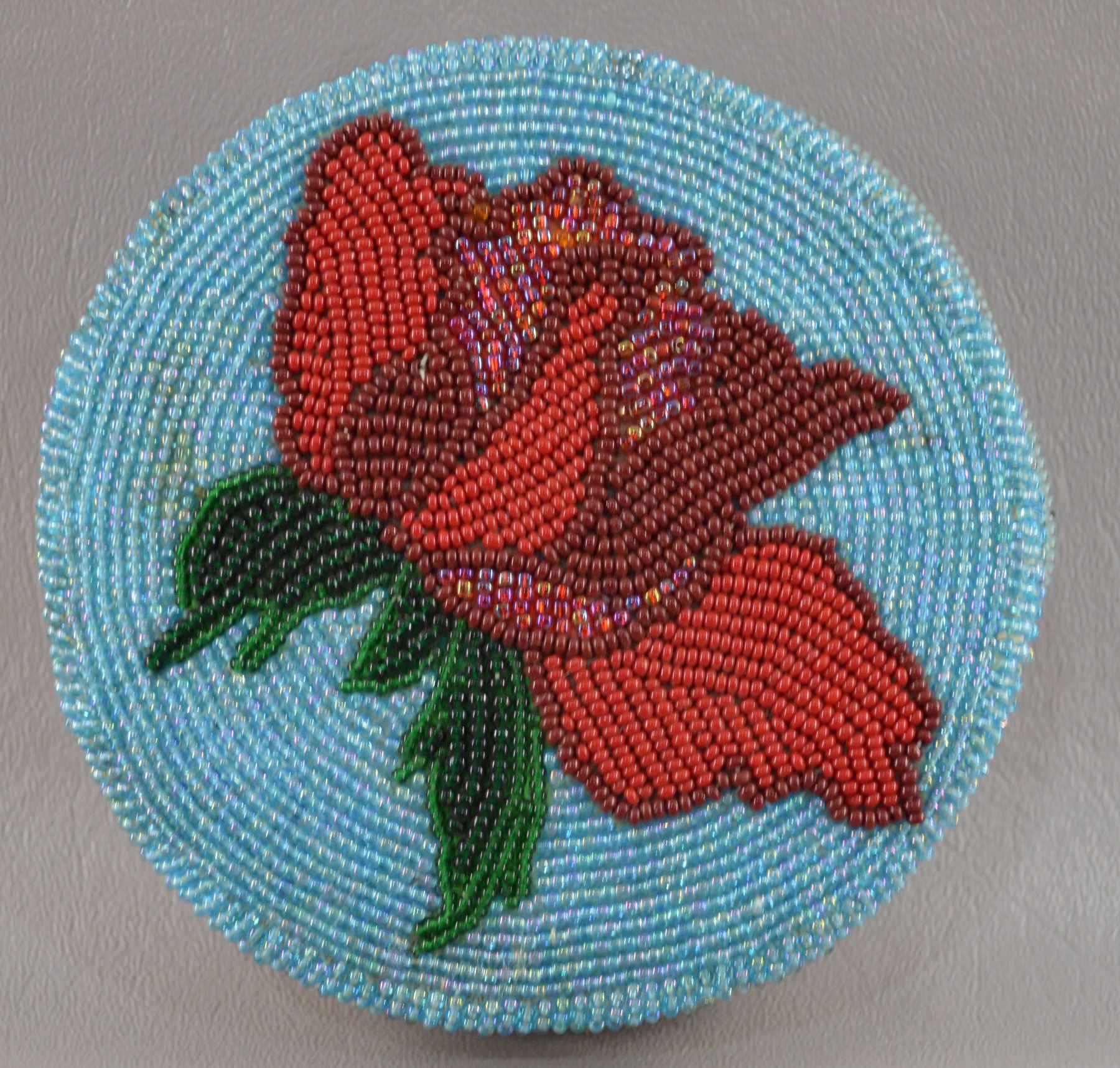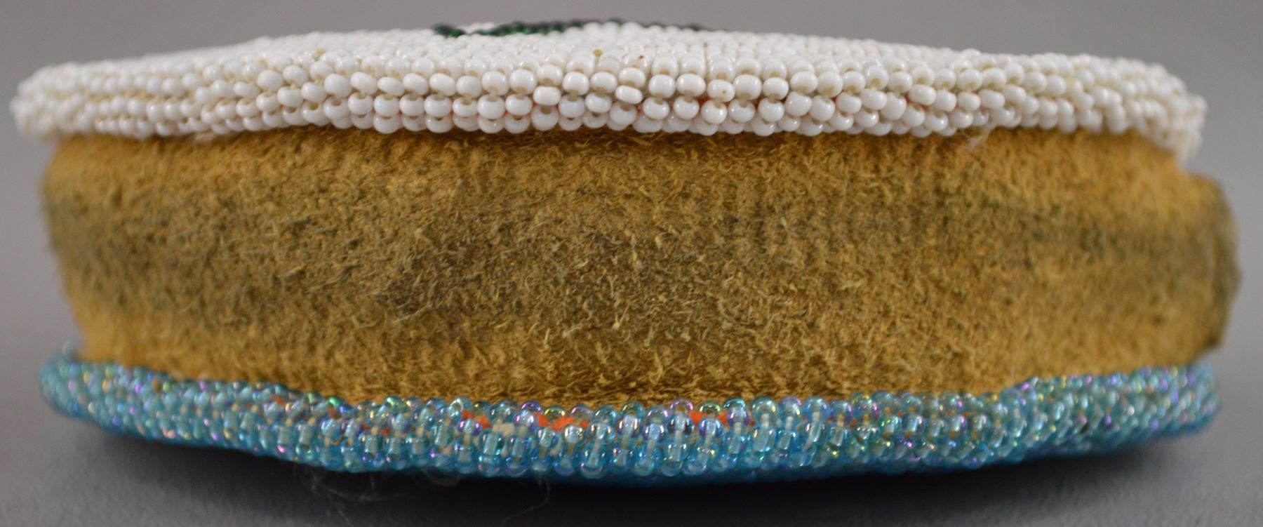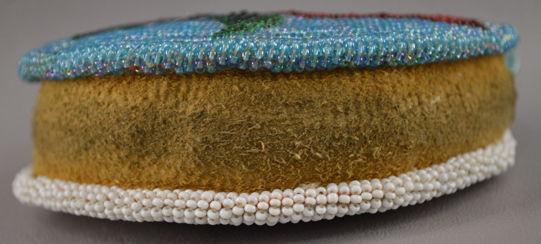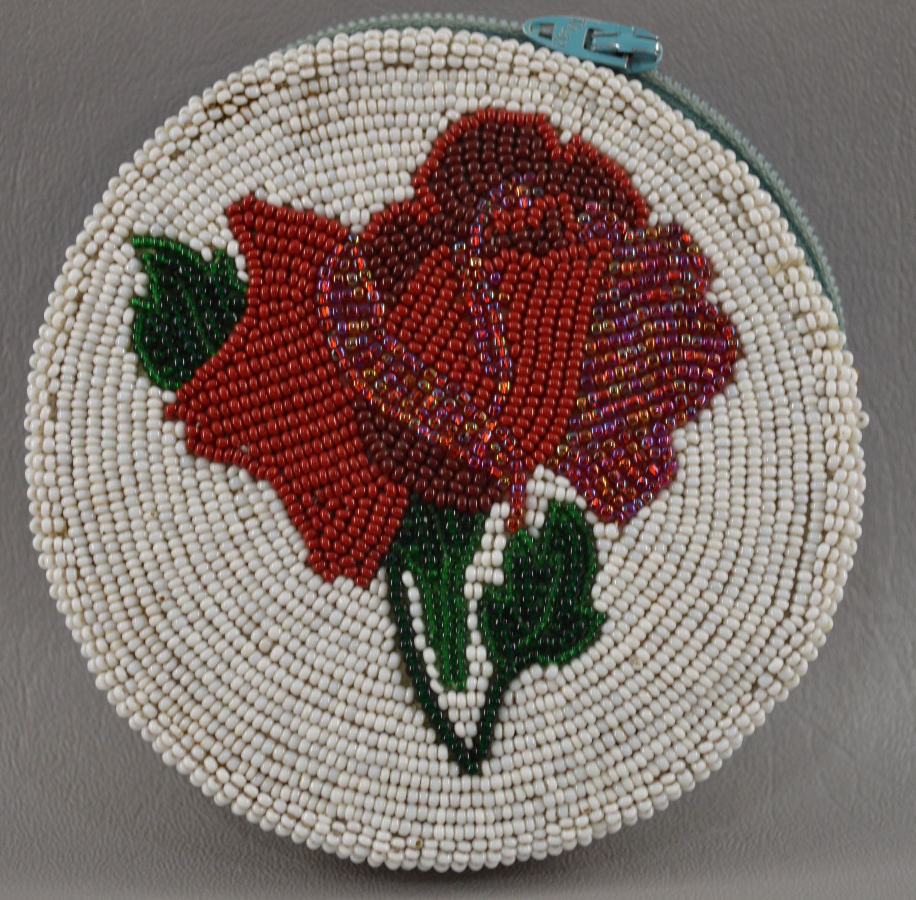 1950's. Hand beaded on leather floral design on both panels. Interior lined with trade cloth, has commercial USA Talon Zipper and dirty spots. 4.75" x 1.5"