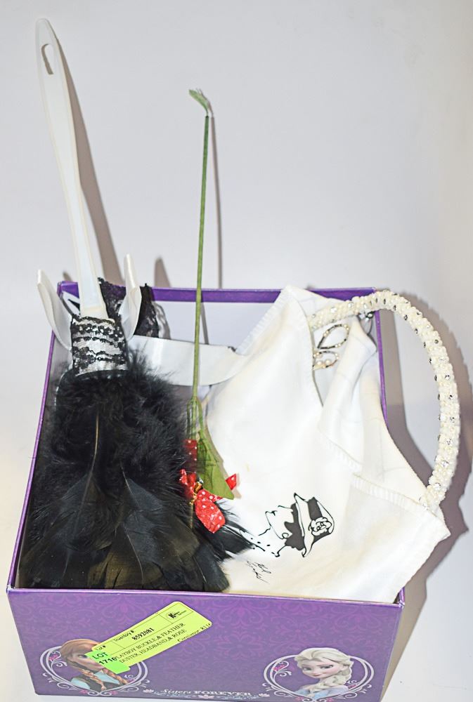 PLAYBOY BUCKLE,& FEATHER DUSTER, HEADBAND,& ROSE