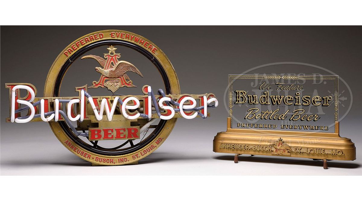 PLEASE NOTE: This lot will not be available for bidding online due to last minute changes to the description. If you are still interested in bidding on this item, please call our office as soon as possible at 207-453-7125. PLEASE NOTE (11/19/13): Some of the neon letters are broken with pieces missing (since photo). LOT OF TWO BUDWEISER BEER LIGHTS. 1) Counter top light consisting of a cast deco metal base concealing the lighting mechanism for the reverse on glass marquee sign. Base cast with "Anheuser-Busch St. Louis, Mo." and the glass sign is reverse etched with gold foil lettering highlights and reads "We Feature Budweiser Bottled Beer Preferred Everywhere". 2) Cast metal Budweiser counter top sign with red and white neon. Manufactured by the France Manufacturing Co., Cleveland, Ohio for the Mt. Vernon Neon Sign Co., Mt. Vernon, Illinois. Circa 1930. SIZE: 1) 16-1/2" w x 10-1/2" t; 2) 24-1/2" w x 16" t. CONDITION: 1) Very good to excellent; in working condition. 2) Very good to excellent; neon tubes and transformer in working condition. 1-13425