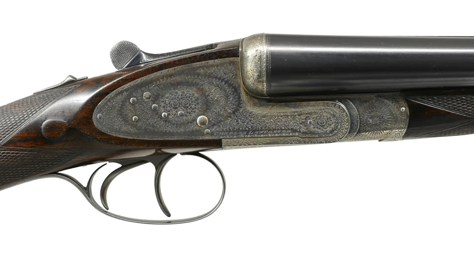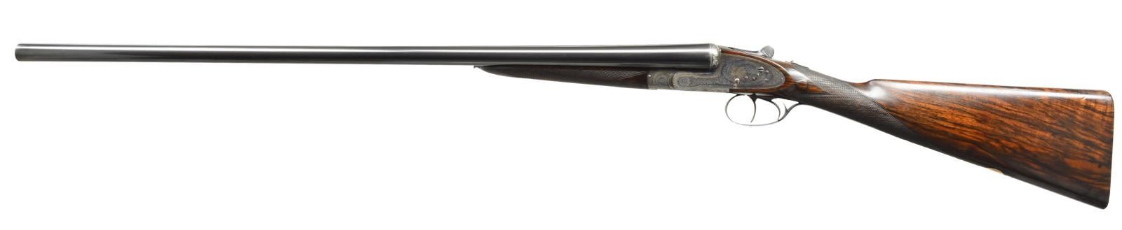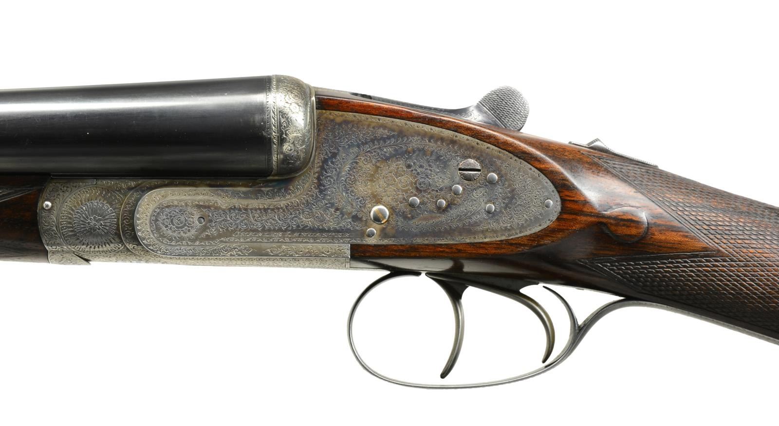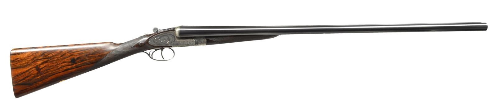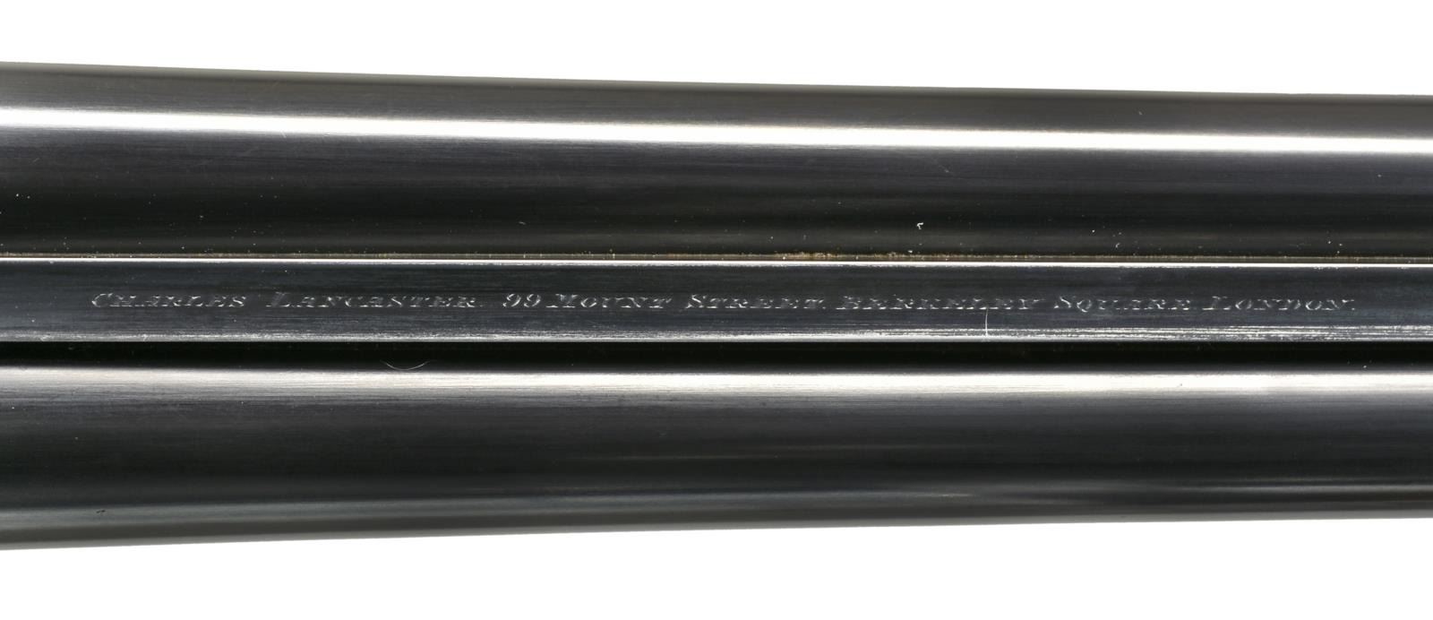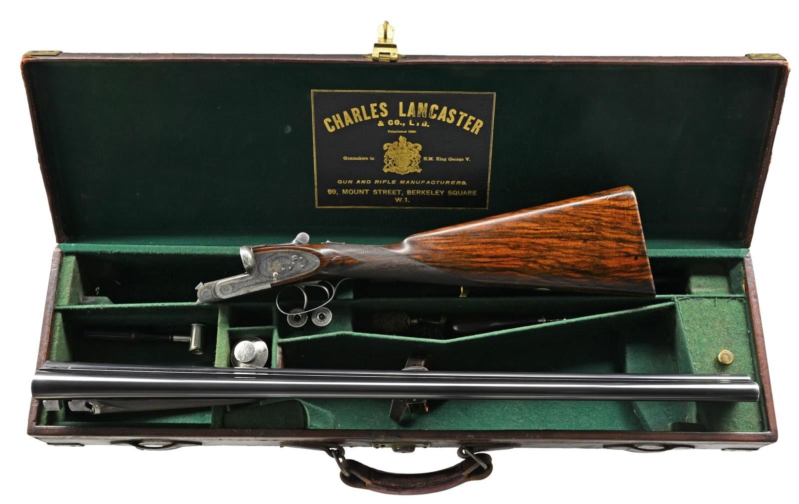 GAME GUN W/ CASE & ACCESSORIES, INCLUDING A LANCASTER CARTRIDGE MAGAZINE. Cal. 12 Ga. S# 14264. (1924). Bbls. 29" Chopperlump, are engraved "Charles Lancaster, 99 Mount Street Berkeley Square, London." on slightly swamped narrow game rib. Bbl. flats are stamped w/ London nitro proofs for 2 1/2" chambers. Case hardened sidelock action is stocked to the fences & features automatic safety (safe inlaid in gold), bushed strikers & double triggers. Action is very nicely filed w/ traditional beads & fillets around locks & on to bottom. Action is engraved w/ near full coverage very cleanly & delicately cut traditional rose & scroll. "Charles Lancaster" is on each lockplate & also in coiled ribbon device on bottom of action over "London". Trigger guard has large open scroll on bow. S# is on tang. Very nicely streaked & lightly figured European walnut straight grip buttstock, measures 14 7/8" over checkered wood butt. Styling is traditional w/ typical Lancaster rounded drop points, flat top point pattern checkering at grip & a gold oval engraved "E. L. M." on toe line. Matching splinter ejector forend has Anson release. MEASUREMENTS: BARRELS: Bore diameter: R 728 L 729. Restriction: R .009 (IC) L .018 (MOD). Min. Wall Thickness: R .025 L .022 STOCK: LOP: 14 7/8". DAC: 1 1/2". DAH: 2+". Cast: 5/8" off. WEIGHT: 6 lbs. 8 oz. UNATTACHED ACCESSORIES: what appears to be original leather case w/ brass corners & central medallion engraved "E. L. Mather COBHAM Surrey" & is embossed "ELM" on top. Interior is lined in green cloth & has gold embossed black leather Lancaster Berkeley Square label in lid. Case contains pair of Lancaster marked snapcaps & rnd. oil bottle. Unmarked accessories include ebony handled turnscrew, Dixon shot measure, the handle of a chamber brush, striker key & 2 piece cleaning rod w/ mops & brush. Also included is a leather trunk type cartridge magazine for 200 12 bore cartridges. Top of magazine is embossed "H.P.D.". A New Bond Street paper Lancaster label is in lid. CONDITION: very fine, partially refinished. Bbls. retaining nearly all of a good quality reblack. Action retains approx. 30% original case hardening color, mostly silvered on bottom & on sharp edges from normal hand wear. Lock plates retain considerably more of their color w/ left plate approaching 90% & right plate at around 60%. Top lever & trigger guard appear to have been reblacked as engraving is slightly softened. There is some subsequent silvering on thumbpiece & sides of trigger guard bow. Stocks have been lightly refinished & have a number of subsequent marks both light & heavy. Checkering does not appear to have been recut & is somewhat worn. Bores are very fine to excellent w/ some minor striations & no evidence of any dents or repairs. Action is tight. Left bbl. is on face, right bbl. shows a glimmer of light. Ejectors very strong & in time. Case leather is dark & has many old scuffs & marks. Straps are missing, original handle is good. Interior cloth is very good w/ some compressions & rubs from bbls. & accessories. Label is very fine w/ single 1/2" rub from contact w/ action. Partitions are good. Magazine case leather is also rubbed on edges, beginning to separate at rear. Interior lid is lined in green cloth which is fine. Label somewhat foxed & oil soaked. Straps & handle are good. A fine fast handling London "best". (20-1687/MGM). CURIO. $6,000-10,000.