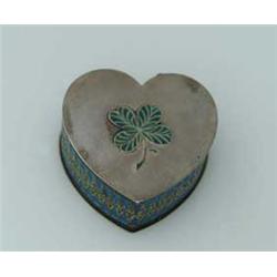 Lot 228 PLIQUE A JOUR BOX. Heart shaped silver box has Plique a Jour enamel, four-leaf clover in the center of the top. Sides are blue Plique a Jour enamel surrounding red Plique a Jour marquis shapes side by side each with a silver Fleur-de-Lis in the center. Hallmarked on the bottom “M900”. SIZE: 1-7/8” w x 3/4” deep. CONDITION: Very good to excellent. 5-69302 (400-600)