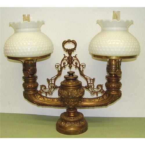 Condition Report: The electric was remove, however we are not sure if it is fitted to actually burn kerosene, we have been told that the glass chiminies are probably not original, overall this is a fine example in good condition.