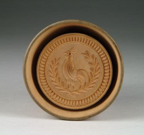 PLUNGER TYPE CARVED WOOD BUTTER MOLD WITH CROWING ROOSTER. The round mold has standing rooster with open beak standing on two large leafy branches and decorative border. SIZE: 3-1/4in. dia print. 5-1/2in. total h x 4-1/4in. dia. CONDITION: Very good. 9-25376