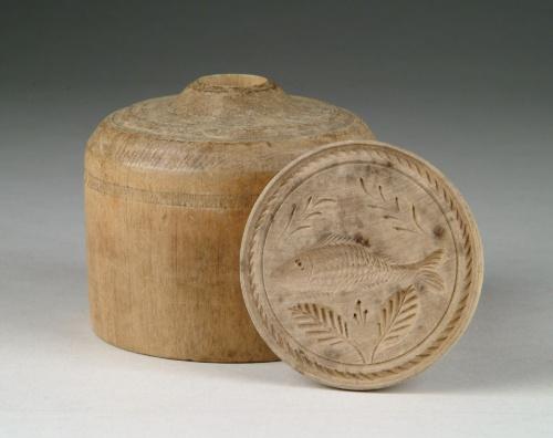 PLUNGER TYPE CARVED WOOD BUTTER MOLD WITH FISH DESIGN. The round print having Carp like fish with leaves and feather type border. SIZE: 3in. dia print. 7in. total h x 3-3/4in. w. CONDITION: Very good. 9-25370