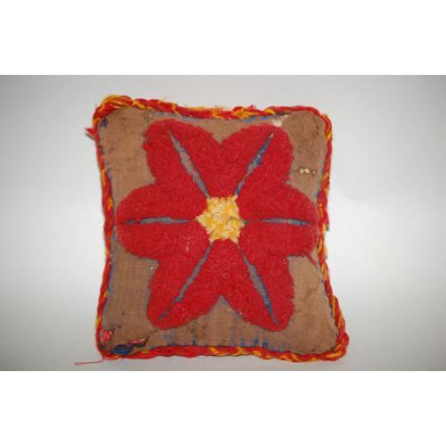 PLUSH VICTORIAN PIN CUSHION - 19TH CENT. SEWN & EMBROIDERED NEEDLE CUSHION W/ SILK & VELVET SIDES W/ WOVEN YARN EDGE & LARGE RED CHINESE FLOWER DECORATION (4 1/4" T X 7" W) - WEAR, LOSSES TO VELVET & SILK, SOILING, IMPERFECTIONS