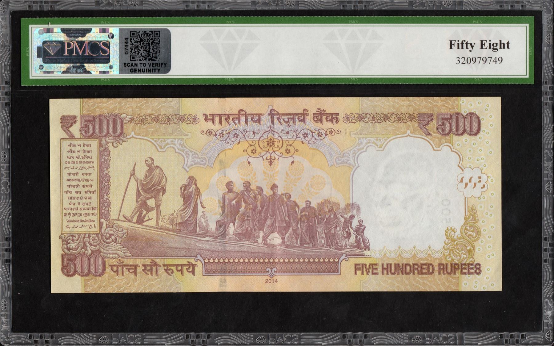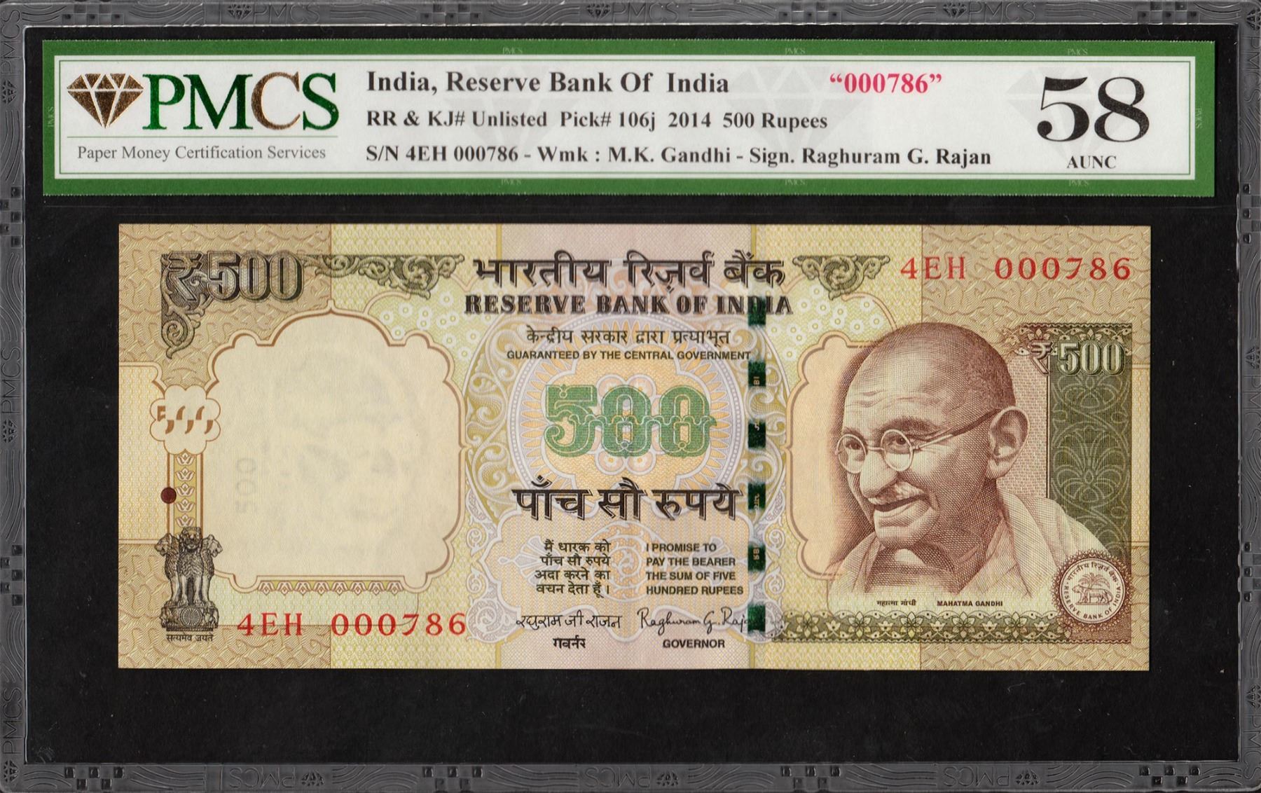 Republic India, 2014, 500 Rupees, 000786, Fancy Number, Signed by Raghuram G. Rajan, Plain Inset, EH Prefix, S. No. 4EH 000786, crisp paper quality, vibrant colours, no pinholes, graded by PMCS as 58 AUNC.